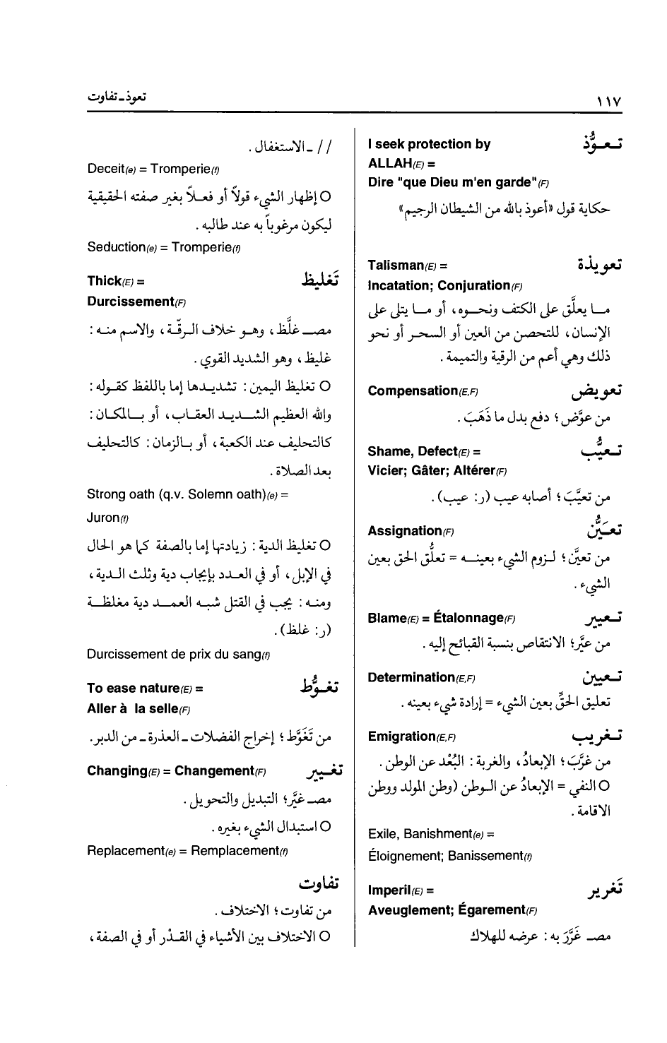 * (وما أنت بتابع قبلتهم) * * من لقي الصحابي مؤمنا ومات على الايمان، وتابع التابعي من لقي التابعي مؤمنات ومات على الايمان ... Successor التابوت: ج توابيت، الصندوق من خشب يوضع فيه المتاع وغيره..Wooden case * (ان آية ملكه أن يأتيكم التابوت فيه سكينة من ربكم) * أي: صندوق إلعهد والوصايا العشرة * الصندوق الذي يوضع فيه الميت ... Coffin التأبيد: من أبد، خلد: ... Eternize * مدة البقاء، ومنه وقف الشئ على التأبيد ... Infinite duration * مدة الحياة، ومنه تأبيد السجن، أي الحكم على المجرم بالسجن ... Lifeimprisonment التأبير: ممص من أبر النخل - أبرا، وإبارة وتأبيرا ": لقح، وبتضعيف الباء المفردة للمبالغة والتكثير.