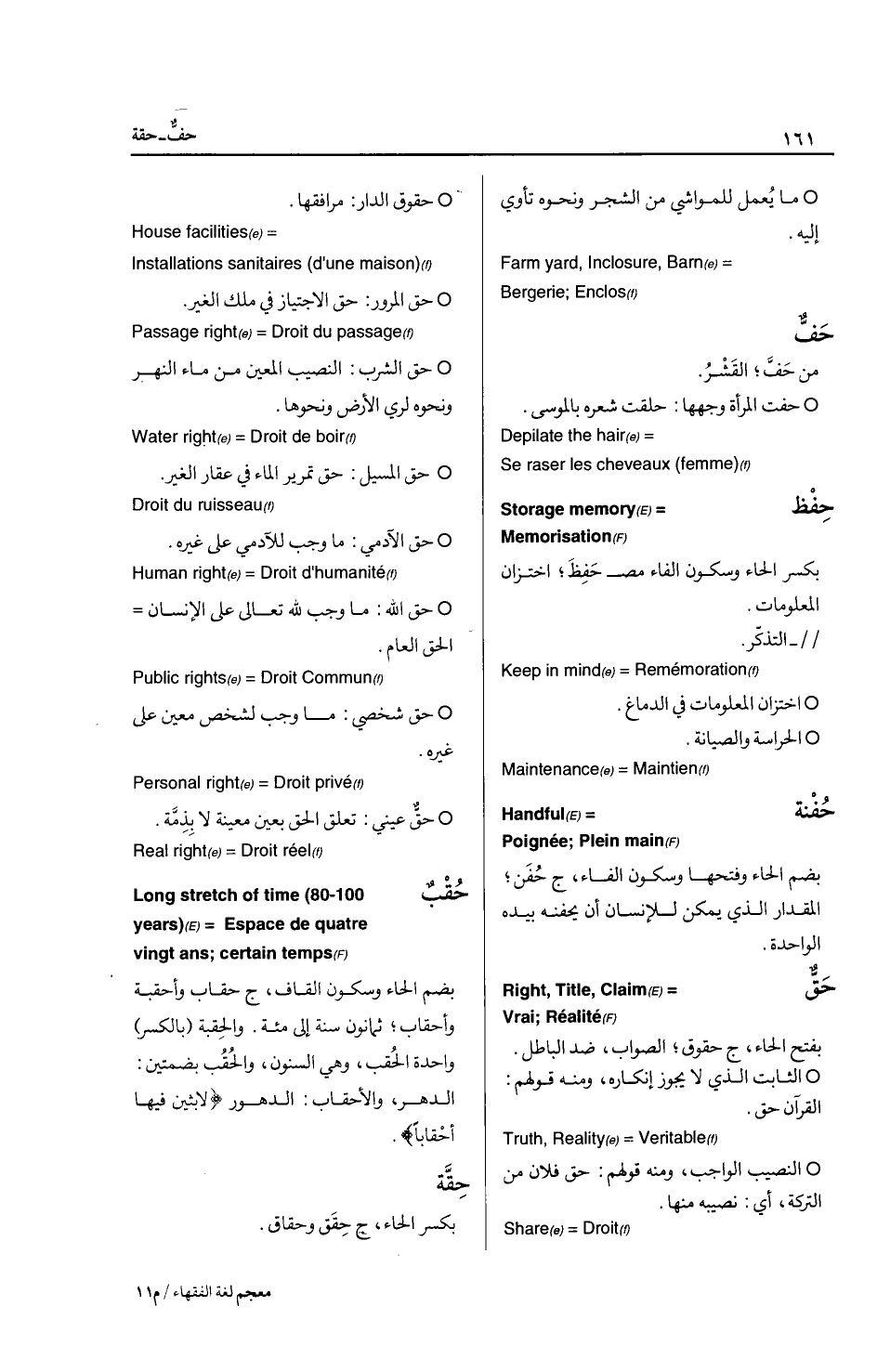 He - goat الجذام: بضم الجيم، داء وبيل، تتهافت منه الاطراف، ويتناثر اللحم من م شدة التقيح ... Leprosy الجذب: مص جذب، الشد ... Pull * الشد * وعند الصوفية جذب الله العبد إلى حضرته، فيظهر للناس مشوش الفكر مختلط الكلام وهو في حقيقته - كما يقولون - من أعقل العقلاء ... Attraction الجذع: بفتح الجيم ثم الذال، الشاب القوي وهو من الغنم ما كان عمره أكثر من ستة أشهر، ومن الابل ما أتم السنة الرابعة ودخل في الخامسة، ومن البقر ما دخل في الثالثة ... Six month) and more (old sheep , and four year old he - camel الجراب: بكسر الجيم، وعاء من جلد يحفظ فيه الزاد / / - قراب السيف.