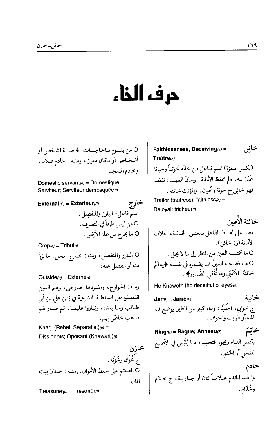 * إتقان الصناعة ... High quality , goodness الجور: التعدي والظلم، ومنه: جار عن الطريق: عدل عنه ... Injustice الجورب: بفتح الجيم والراء، لفظ معرب، ج جوارب، ما يلبس من القماش ونحوه بالقدمين إلى ما فوق الكعبين ... Stocking الجوشن: ج جواشن، لفظ معرب، وهو الدرع الذي يغطي الصدر ... Armor الجوهر: لفظ معرب، وهو الذي يخرج من البحر، وما يجري مجراه في النفاسة، كالياقوت والزبرجد، واحدته جوهرة ... Jewel