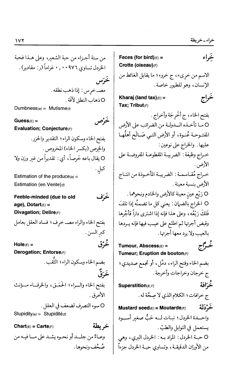 * ما وجد بعد أن لم يكن ... Occurrence * الواقعة التي تحتاج إلى فتوى ... Event الحارس: ج حراس وحرسة، من يقوم بالحراسة ... Keeper * من يقوم بحفظ الشئ، ومنه: الحارس القضائي وهو الشخص الذي تعينه المحكمة لحفظ مال شخص محجوز عليه أو غائب ... Sequestrator الحارصة: بكسر الراء، الجرح التي تحرص الجلد، أي: تشقه قليلا.