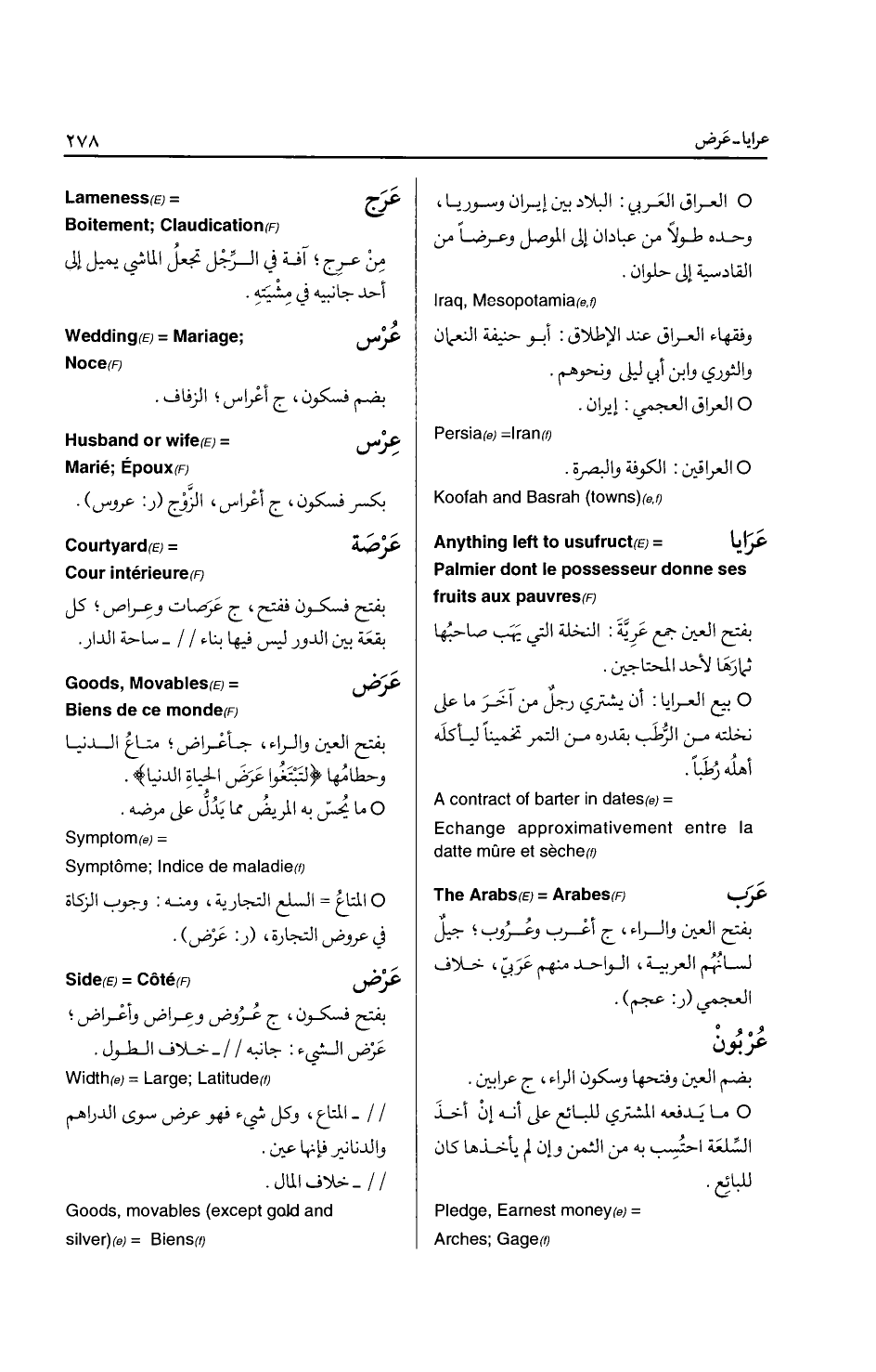 لا وجود له في الحقيقة ... (Simulation absolue) F 2) الصورية النسبية بالتستر: وهي إخفاء تصرف في صورة تصرف آخر، كاخفاء هبة في صورة بيع ... Insignificant الصوف: بضم الصاد، ج أصواف، ما يغطى جلد الضأن من الشعر ... Wool الصوفية: أسلوب متميز بتهذيب النفس والسمو بالروح وتقويم السلوك، وقد أسرف بعضهم فاتبع طريقة غير الاسلام في ذلك فضل وأضل ... Mysticism الصوم: بفتح فسكون، ج أصوام مص صام، الامساك عن الطعام والشراب والجماع من مطلع الفجر الصادق إلى غروب الشمس ... Fast * صوم الوصال: أن يصل صيام أيام متعددة دون أفطار بينها ... Continuous fast * شهر الصوم: شهر رمضان (ر: رمضان) .