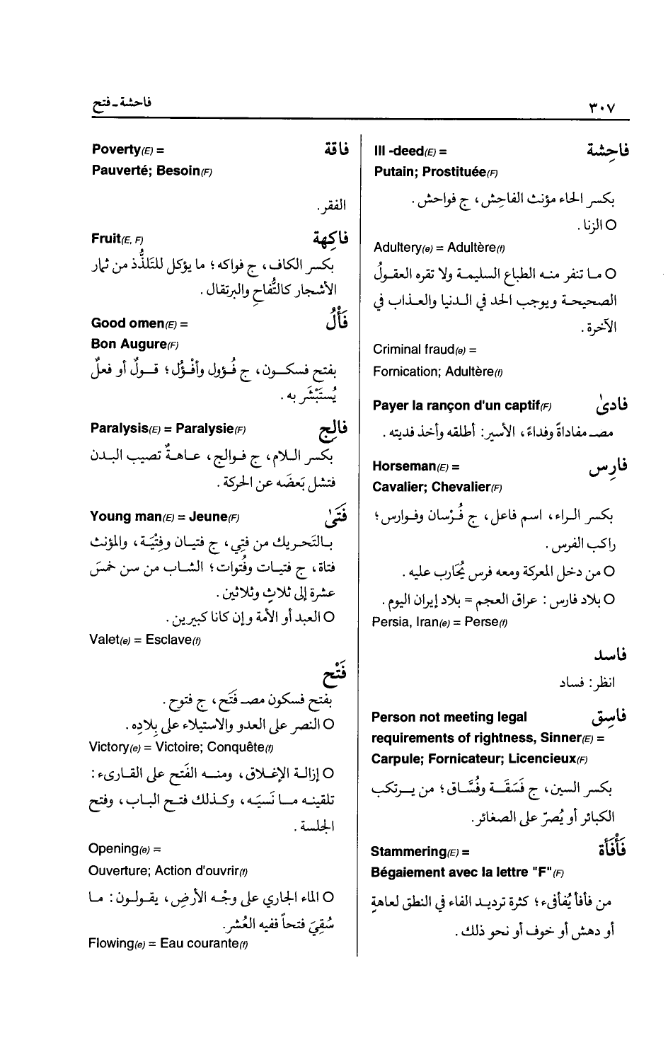 التصرفات ما فيه خسة، ج عدول ... Honorable or of good character * التوسط بين الافراط والتفريط ... Fair * المساواة، ومنه * (أو عدل ذلك صياما) * ... Equity العدم: بفتح العين والدال، ضد الوجود ... Nullity * الفقر، لعدم وجود السعة في الرزق ... Poverty العدو: بفتح فضم، ج أعداء وأعاد، الخصم المعادي.