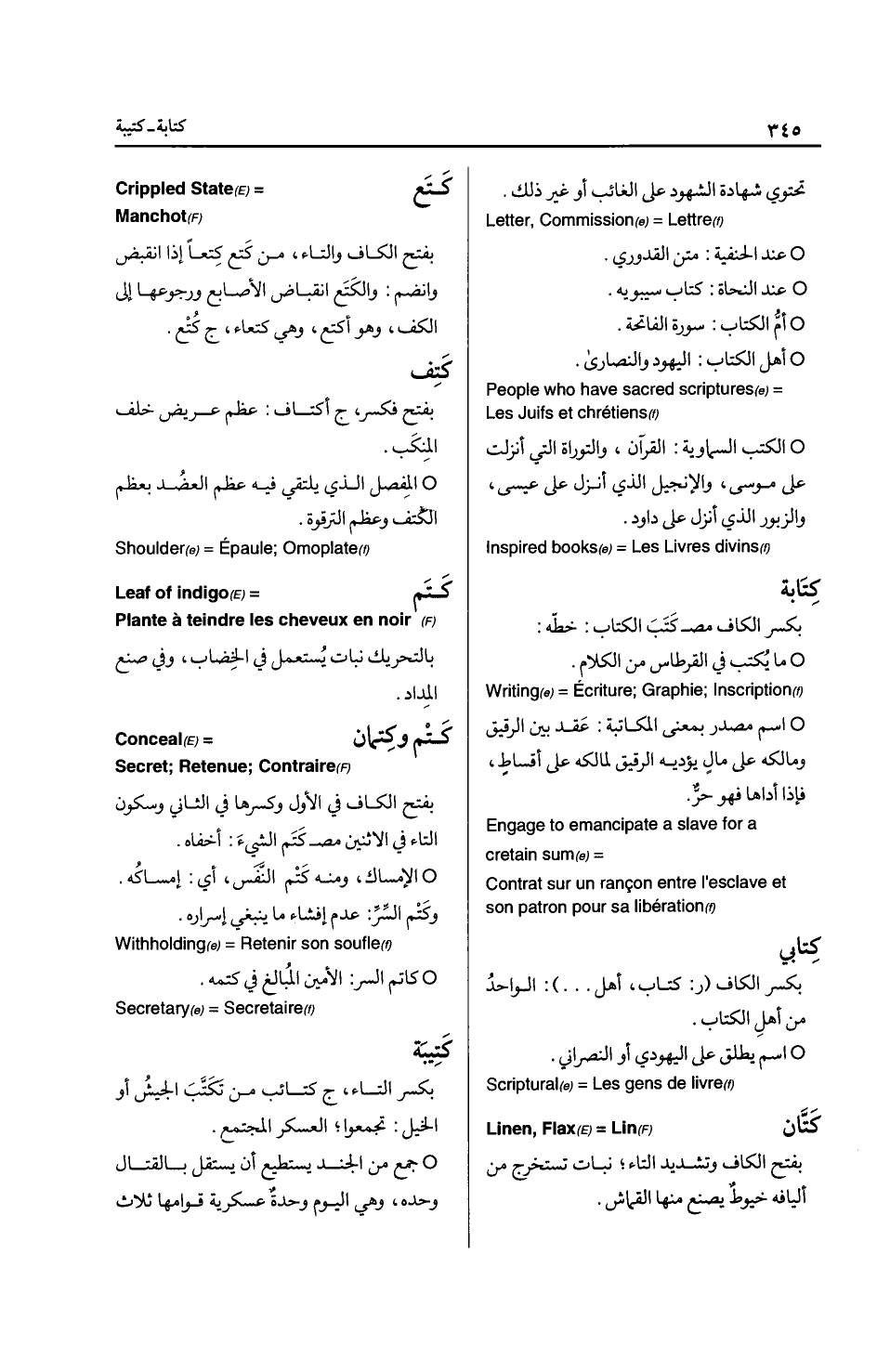 الفريضة: مص فرض وافترض ج فرائض (ر: فرض) ... Religious duty * ما أوجبه الله تعالى على عباده ... Divine commandment * ما فرض في السائمة من الزكاة ... Tithe from cattle الفزع: بالتحريك مص فزع، الخوف والذعر ... Alarm , fright الفساد: بفتح الفاء مص فسد وفسد، التلف والعطب ... Deterioration , decay / / - الجدب والقحط، ومنه * (ظهر الفساد في البر والبحر) * ... Mischief * الفساد عند الحنفية يختلف في العبادات عنه في المعاملات: ففي العبادات، كل فاسد هو باطل.