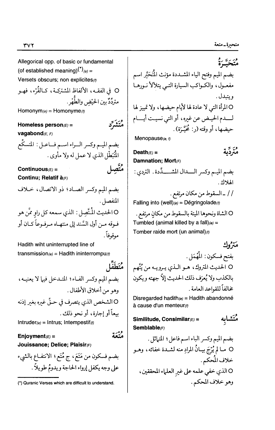 القومية: بفتح فسكون، رابطة تقوم على أساس الاشتراك في الجنس بقطع النظر عن المبادئ والمضمون، كالقومية العربية ... Nationalism القئ: بفتح فسكون مص قاء إذا أخرج ما بداخله، واستقاء وتقيا: تكلف القئ، والقئ: ما قذفته المعدة مما فيها عن طريق الفم ... Vomit القياس: بكسر القاف مص قاس، التقدير.