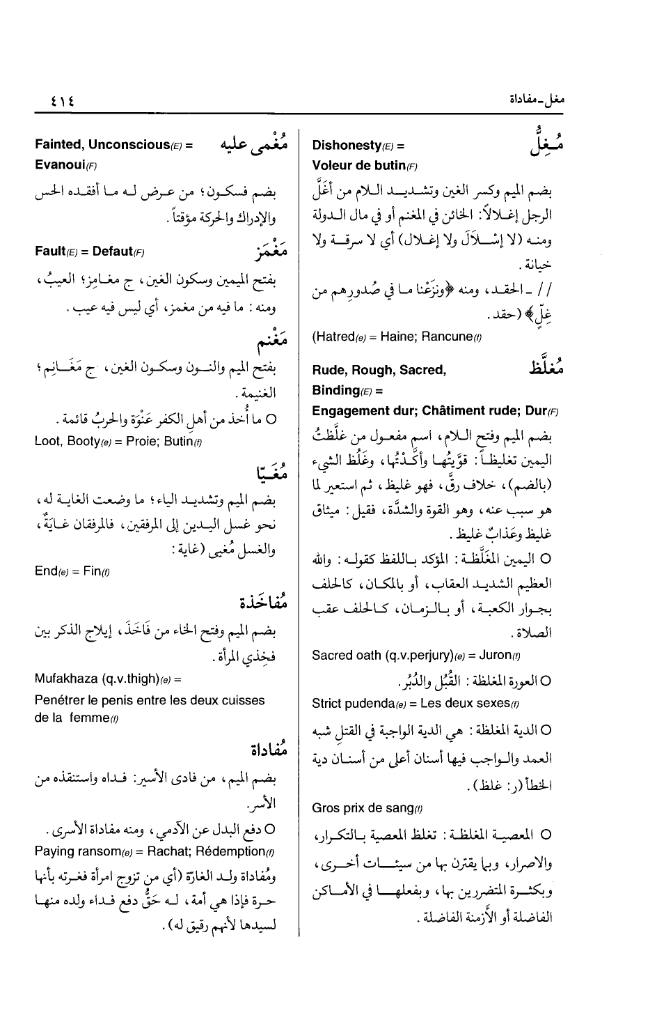 Bet or wager * التصرف الذي قد يؤدي إلى الضرر ... Risk المخافتة: بضم الميم من خفت الصوت: سكن ... Silencer * الاسرار بالكلام، ومنه * (ولا تجهر بصلاتك ولا تخافت بها) *.. (* Reduce to silence هامش) * their benefit in evident) * (and that they are free from diseases and blights , and The sale of grain or vegetables bef ore it is ripe