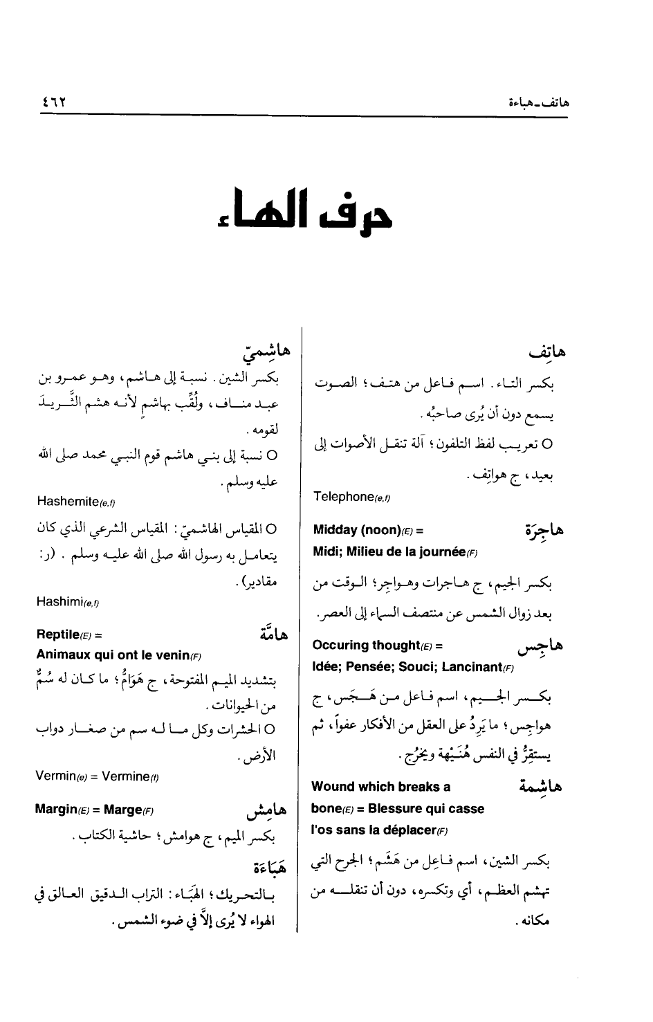 * مواضع متعبدات الحج، والمناسك: المتعبدات، كلها، وقد غلب إطلاقها على أفعال الحج لكثرة أنواعها ... (Ritual) of Hadj المناصرة: مفاعلة من ناصر، التأييد والمعاونة ... Backing المناضلة: من ناضل، والنضل: السبق، بذل الجهد للتفوق في نحو المسابقات، للتفوق على الاقران وإثبات الذات، لكسب النصر في الجهاد.