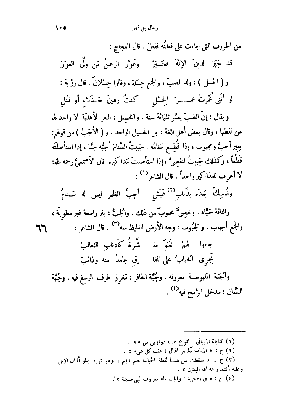 ويقال: إنّ الضبّ يعمِّر ثلثمائة سنة. والحَسِيل: البقر الأهليّة لا واحد لها من لفظها، وقال بعض أهل اللغة: بل الحسيل الواحد. والأجَبُ من قولهم: بعِبر أجبُّ ومجبوب، إذا قُطِع سَنامُه. جَببتُ السِّنامَ أجبُّه جبّاً، إذا استَأصلتَه قَطْعاً، وكذلك جَببتُ الخِصيَّ، إذا استأصلتَ مَذاكيره. قال الأصمعيُّ رحمه الله: لا أعرِف للمذاكير واحداً. قال الشاعر: