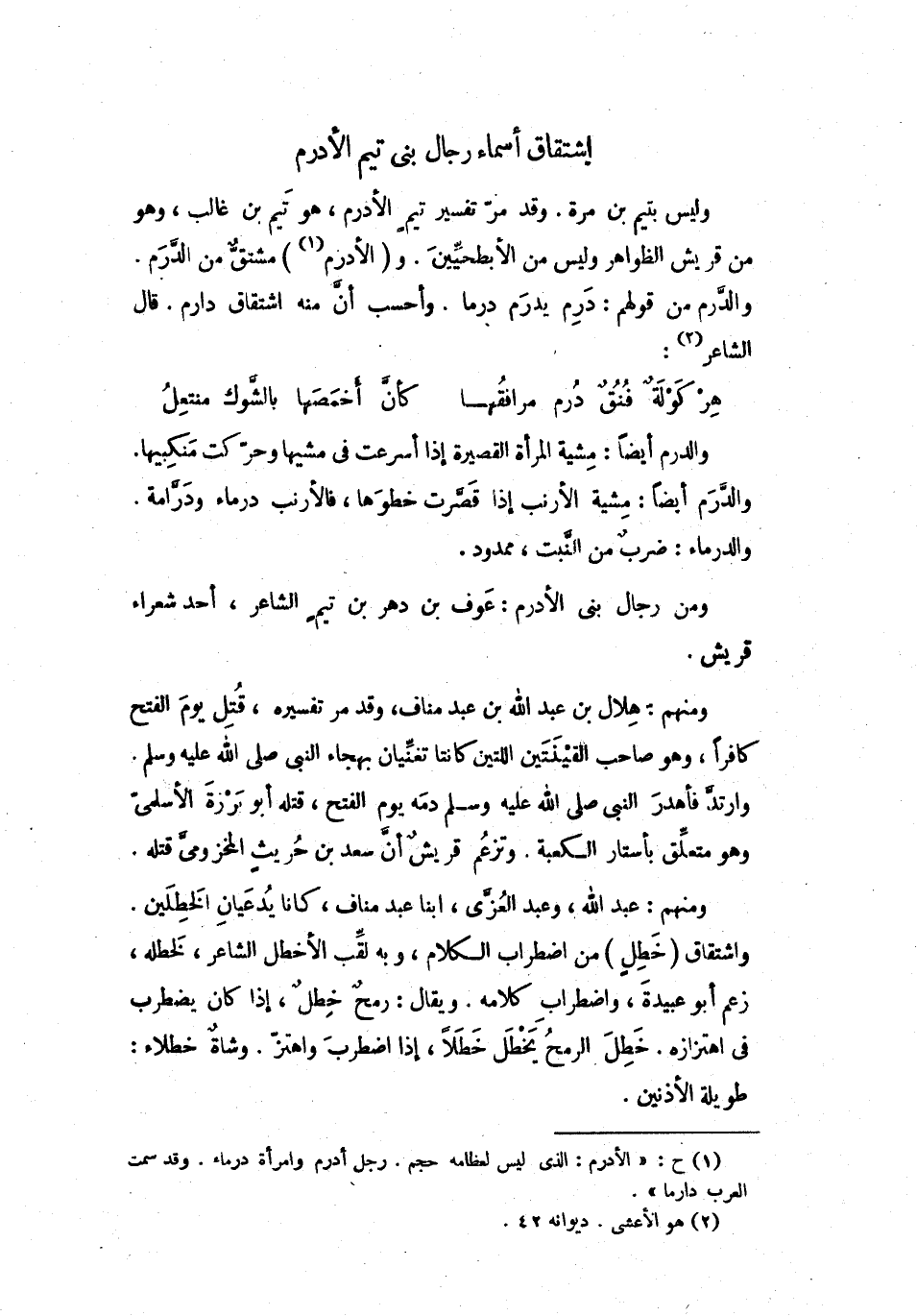 وليس بتيم بن مرة. وقد مرّ تفسير تيمٍ الأدرم، هو تَيم بن غالب، وهو من قريش الظواهر وليس من الأبطحيِّينَ. والأدرم مشتقٌّ من الدَّرَم. والدَّرم من قولهم: دَرِم يدرَم درماً. وأحسب أن منه اشتقاق دارم. قل الشاعر: