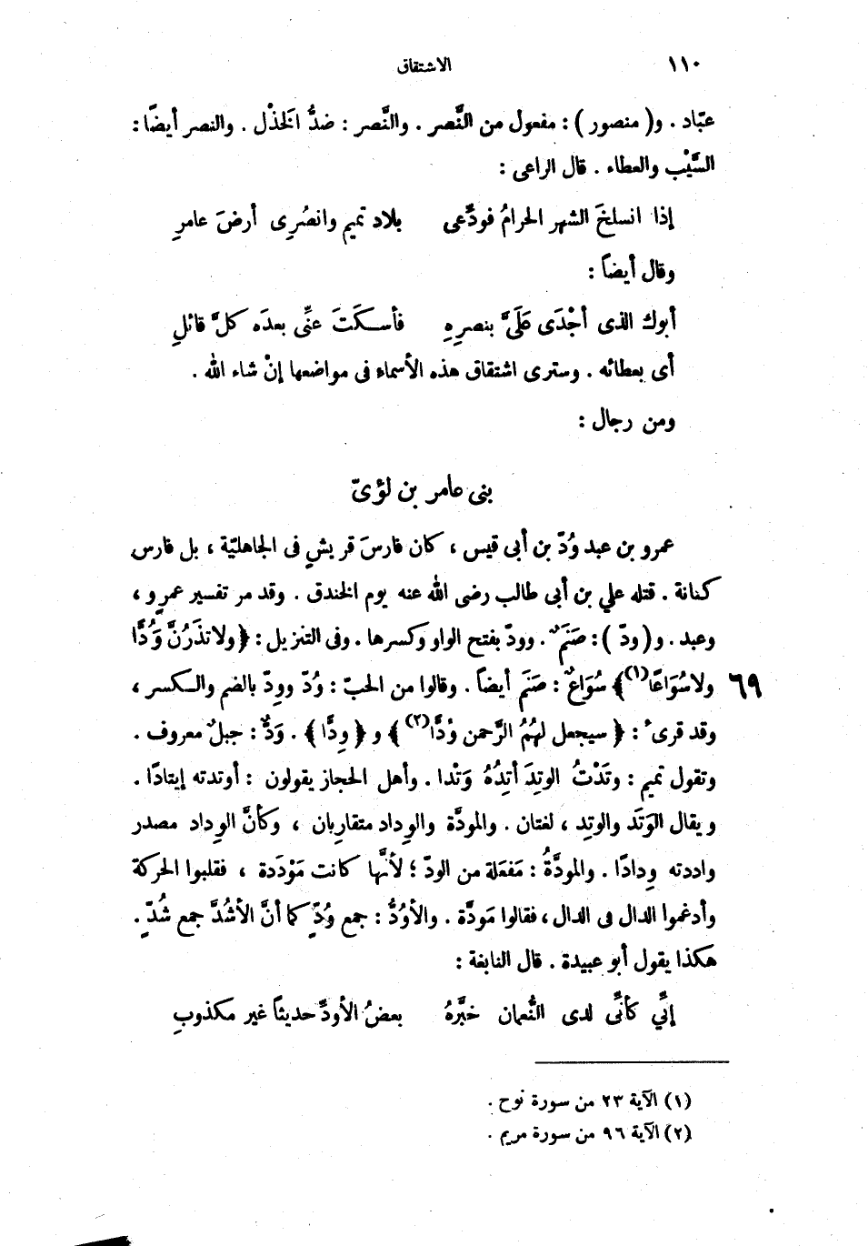 عمرو بن عبد وُدّ بن أبي قيس، كان فارسَ قريشٍ في الجاهليّة، بل فارس كنانة، قتله علي بن أبي طالب رضي الله عنه يوم الخندق. وقد مر تفسير عمرو، وعبد. وودّ: صَنَمٌ. وودّ بفتح الواو وكسرها. وفي التنزيل: " ولا تذَرُنَّ وَدَّاَُ ولا سُوَاعاً " سُوَاعٌ: صَنَم أيضاً. وقالوا من الحبّ: وُدّ ووِدّ بالضم والكسر، وقد قرئ: " سيجعل لهُمُ الرَّحمن وُدّاً " و " وِدّاً ". وَدٌّ: جبلٌ معروف. وتقول تميم: وتَدْتُ الوتِدَ أتِدُهُ وَتْدا. وأهل الحجاز يقولون: أوتدته إيتاداً. ويقال الوَتَد والوتِد، لغتان. والمودَّة والوِداد متقارِبان، وكأنَّ الوِداد مصدر واددته وِداداً. والمودَّةُ: مَفعَلة من الودّ؛ لأنَّها كانت مَوْدَدة، فقلبوا الحركة وأدغموا الدال في الدال، فقالوا مَودَّة. والأوُدُّ: جمع وُدٍّ كما أنَّ الأشُدَّ جمع شُدٍّ. هكذا يقول أبو عبيدة. قال النابغة: