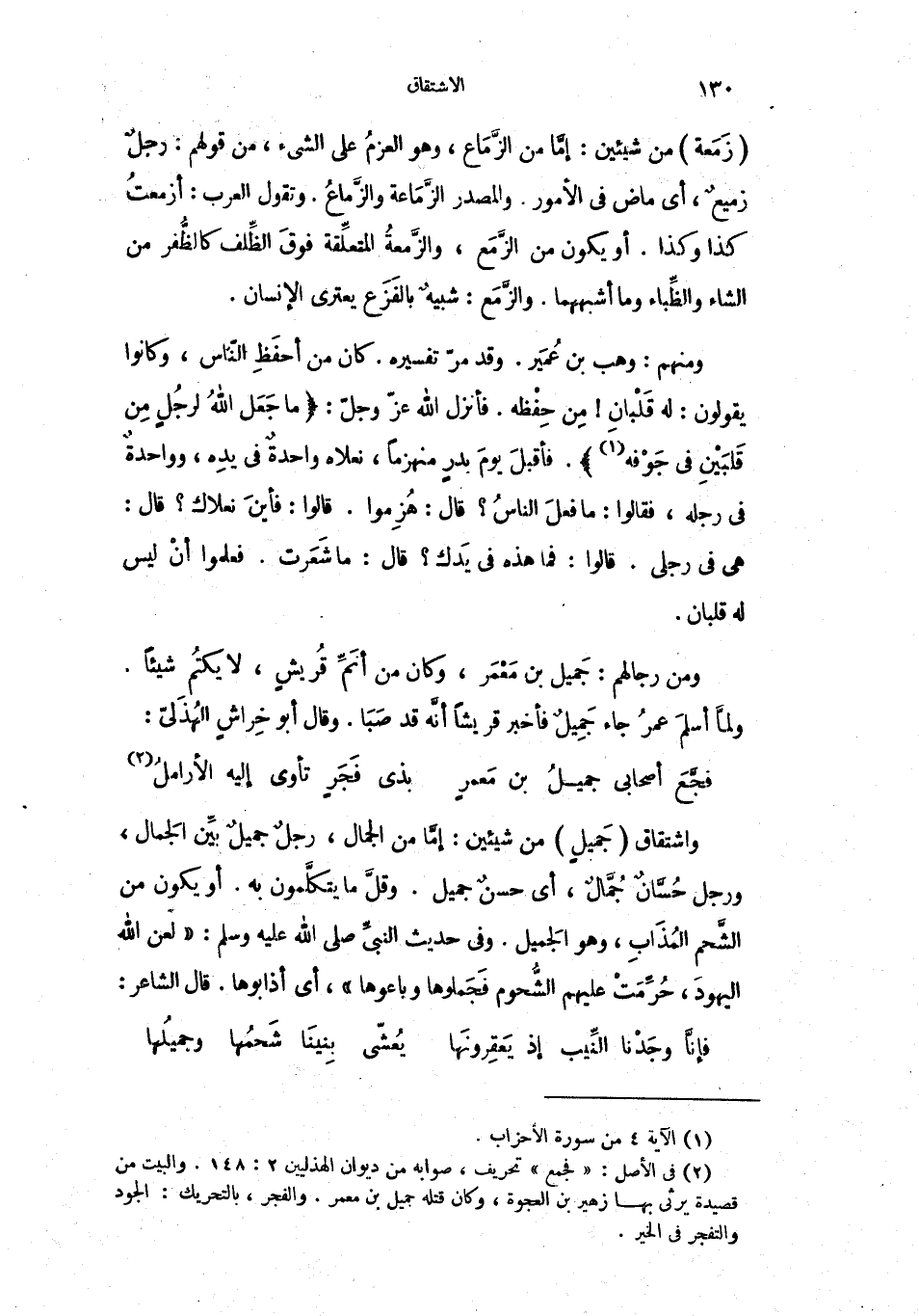 واشتقاق جَميلٍ من شيئين: إمَّا من الجمال، رجلٌ جميلٌ بيِّن الجَمال، ورجل حُسَّانٌ جُمَّالٌ، أي حسنٌ جميل. وقلَّ ما يتكلَّمون به. أو يكون من الشَّحم المُذَابِ، وهو الجَميل. وفي حديث النبيِّ صلى الله عليه وسلم: " لعن الله اليهودَ، حُرِّمَتْ عليهم الشُّحوم فَجَملوها وباعوها "، أي أذابوها. قال الشاعر: