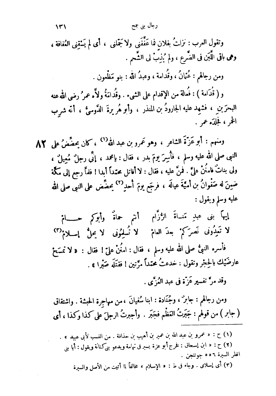 ومنهم: أبو عَزَّةَ الشاعر، وهو عَمرو بن عبد الله، كان يحضِّضُ على النبي صلى الله عليه وسلمن فأُسِرَ يومَ بدر، فقال: يا محمد: إنِّي رجلٌ مُعِيلٌ، ولي بناتٌ فامنُنْ عليَّ. فمنَّ عليه، فقال: لا أقاتل محمَداً أبداً! فلمَّا رجع إلى مكَّة ضمِنَ له صَفْوانُ بن أميِّةَ عيالَه، فرجَع يومَ أُحدٍ يحضِّض على النبي صلى الله عليه وسلم ويقول: