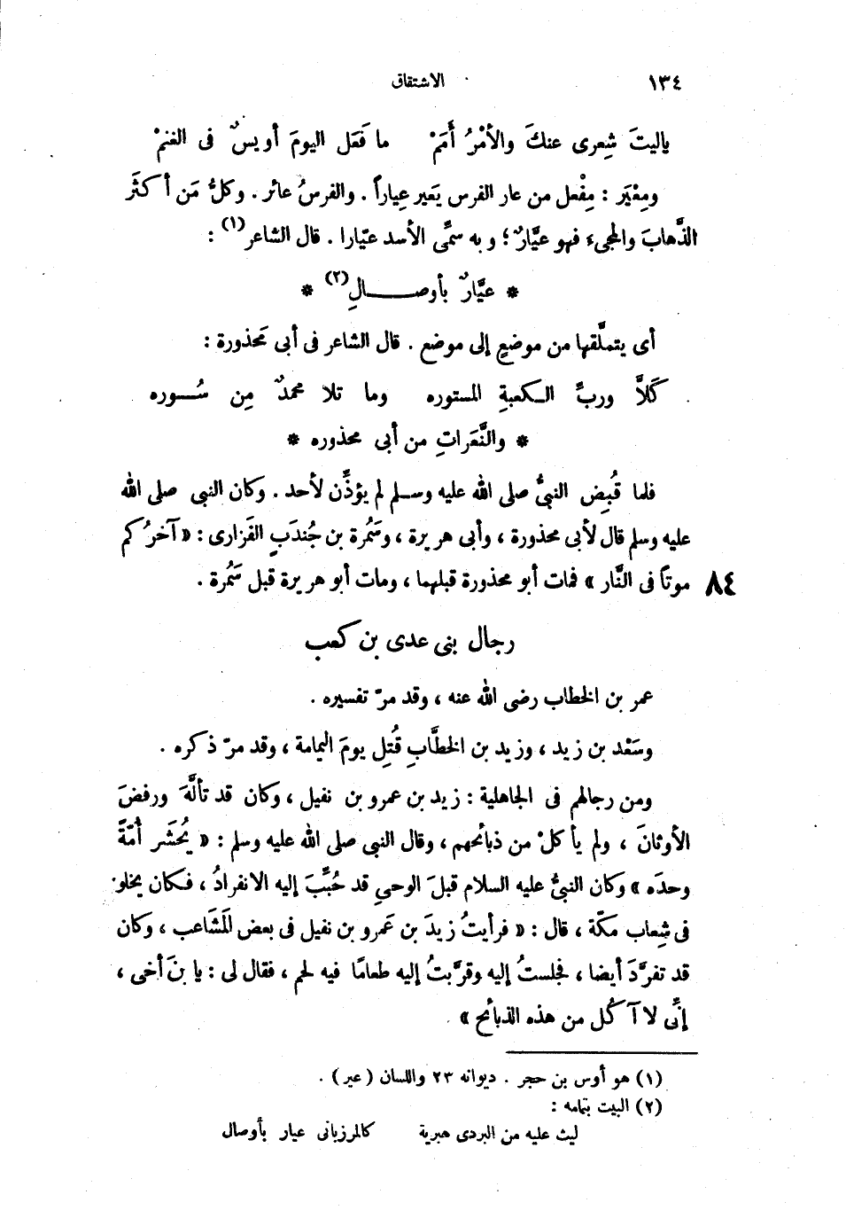 ومن رجالهم في الجاهلية: زيد بن عمرو بن نفيل، وكان قد تألَّهَ ورفضَ الأوثانَ، ولم يأكلْ من ذبائحهم، وقال النبي صلى الله عليه وسلم: " يُحشَر أُمّةً وحدَه " وكان النبيُّ عليه السلام قبلَ الوحي قد حُبِّبَ إليه الانفرادُ، فكان يخلو في شِعاب مكّة، قال: " فرأيتُ زيدَ بن عَمرو بن نفيل في بعض المَشَاعب، وكان قد تفرَّدَ أيضاً، فجلستُ إليه وقرَّبتُ إليه طعاماً فيه لحم، فقال لي: يا بنَ أخي، إنِّي لا آكُل من هذه الذبائح ".