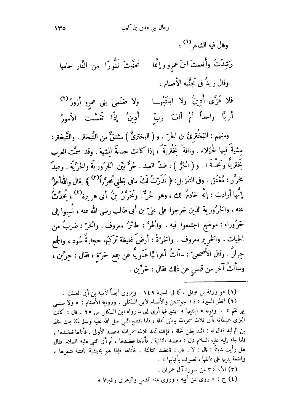 ومنهم: البَخْترِيُّ بن الحرّ. والبختريُّ مشتقُّ من التَّبختر. والتَّبختر: مِشيةٌ فيها خُيَلاء. وناقةٌ بَخْتريّةٌ، إذا كانت حسنةَ المِشية. وقد سمَّت العرب بَختريّاً وبَخْتَراً. والحُرُّ: ضدّ العبد. حُرٌّ بيِّن الحُرُوريّة والحرِّيّة. وعبدٌ محرَّر: مُعْتَق. وفي التنزيل: " نَذَرْتُ لَكَ ما في بَطنِي مُحرَّراً " يقال والله أعلمُ إنَّها أرادت: إنَّه خادمٌ لك، وهو حُرٌّ. ومُحَرَّرُ بنُ أبي هريرة، يُحدَّثُ عنه. والحَرُورية الذين خرجوا على عليِّ بن أبي طالب رضي الله عنه، نُسِبوا إلى حَرُوراء: موضعٍ اجتمعوا فيه. والحُرُّ: طائرٌ معروف. والحُرّ: ضربٌ من الحيات. والحَرِير معروف. والحَرّةُ: أرضٌ غليظة تركبُها حجارةٌ سُود، والجمع حِرارٌ. وقال الأصمعيِّ: سألتُ أعرابيِّاً غَنَويّاً عن جمع حَرّةٍ، فقال: حِرَّين، وسالتُ آخر من قيسٍ عن ذلك فقال: حَرِّين.