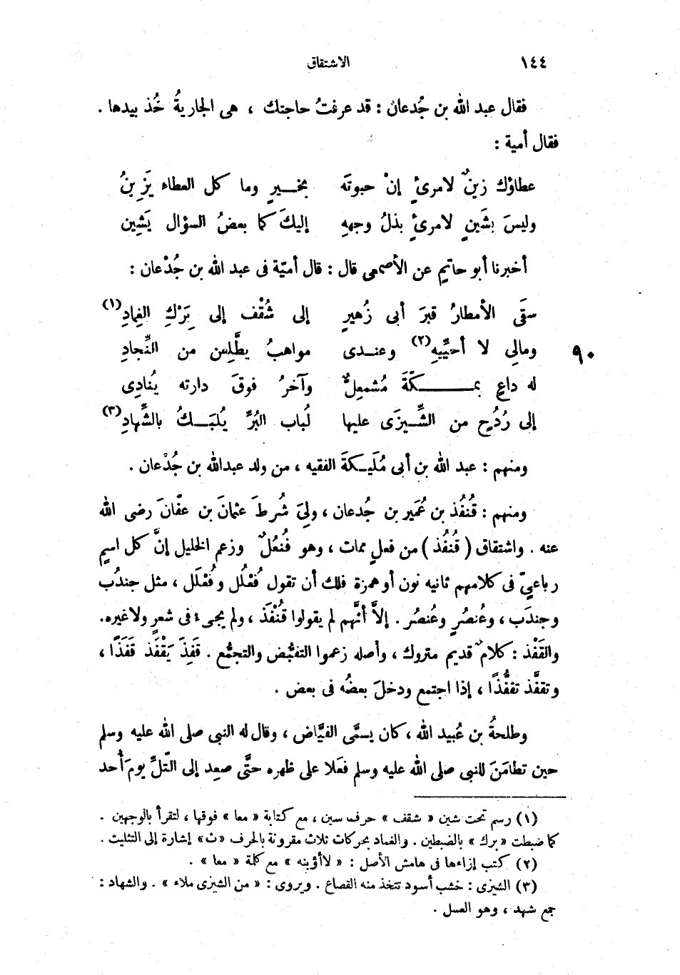 ومنهم: قُنُفذ بن عُمَير بن جُدعان، ولِيَ شُرطَ عثمانَ بن عفّانَ رضي الله عنه. واشتقاق قُنفُذ من فعلٍ ممات، وهو فُنعُلٌ. وزعم الخليل أنَّ كل اسمٍ رباعيّ في كلامهم ثانيه نون أو همزة فلك أن تقول فُعْلُل وفُعْلَل، مثل جندُب وجندَب، وعُنصُرٍ وعُنصُر. إلاَّ أنَّهم لم يقولوا قُنْفَذ، ولم يجيء في شعر ولا غيره. والقَفْذ: كلامٌ قديم متروك، وأصله زعموا التفبُّض والتجمُّع. قَفِذَ يَقْفَذ قَفَذّا، وتقفَّذاً، إذا اجتمع ودخلَ بعضُه في بعض.