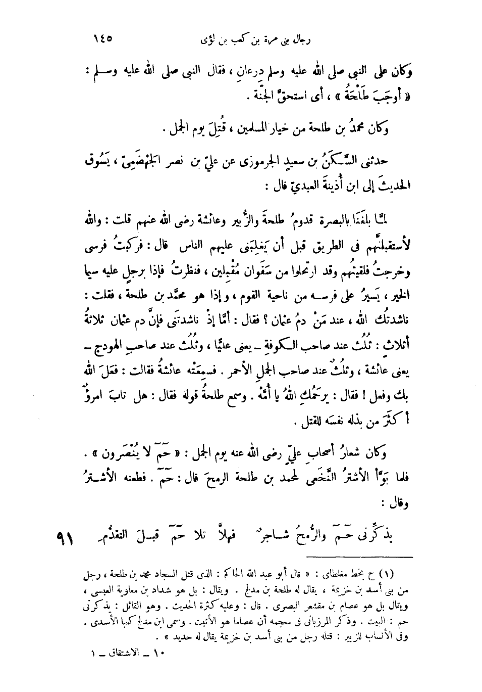 حدثني السًّكَنُ بن سعيدٍ الجرموزي عن عليّ بن نصر الجَهْضَمِيّ، يَسُوق الحديثَ إلى ابن أُذينةَ العبديّ قال: لمَّا بلغَنَا بالبصرة قدومُ طلحةَ والزُّبير وعائشة رضي الله عنهم قلت: والله لأستقبلنَّهم في الطريق قبل أن يَغلِبَني عليهم الناس. قال: فرِكبتُ فرس وخرجتُ فلقيتُهم وقد ارتحلوا من سَفَوان مُقْبِلين، فنظرتُ فإذا برجلٍ عليه سيما الخير، يَسيرُ على فرِسه من ناحية القوم، وإذا هو محمد بن طلحة، فقلت: ناشدتُك الله، عند مَنْ دمُ عثمان؟ فقال: أمَّا إذْ ناشدتَني فإنَّ دم عثمان ثلاثةُ أثلاثٍ: ثُلُث عند صاحب الكوفةِ يعني عليَّاً، وثُلُث عند صاحبِ الهودج يعني عائشة، وثلثٌ عند صاحب الجملِ الأحمر. فسمِعَتْه عائشةُ فقالت: فعَلَ الله بك وفعل! فقال: يرحَمُكِ اللهُ يا أُمَّهْ. وسمع طلحةُ قوله فقال: هل تابَ امرؤٌ أكثَرَ منم بذله نفسَه للقتل.