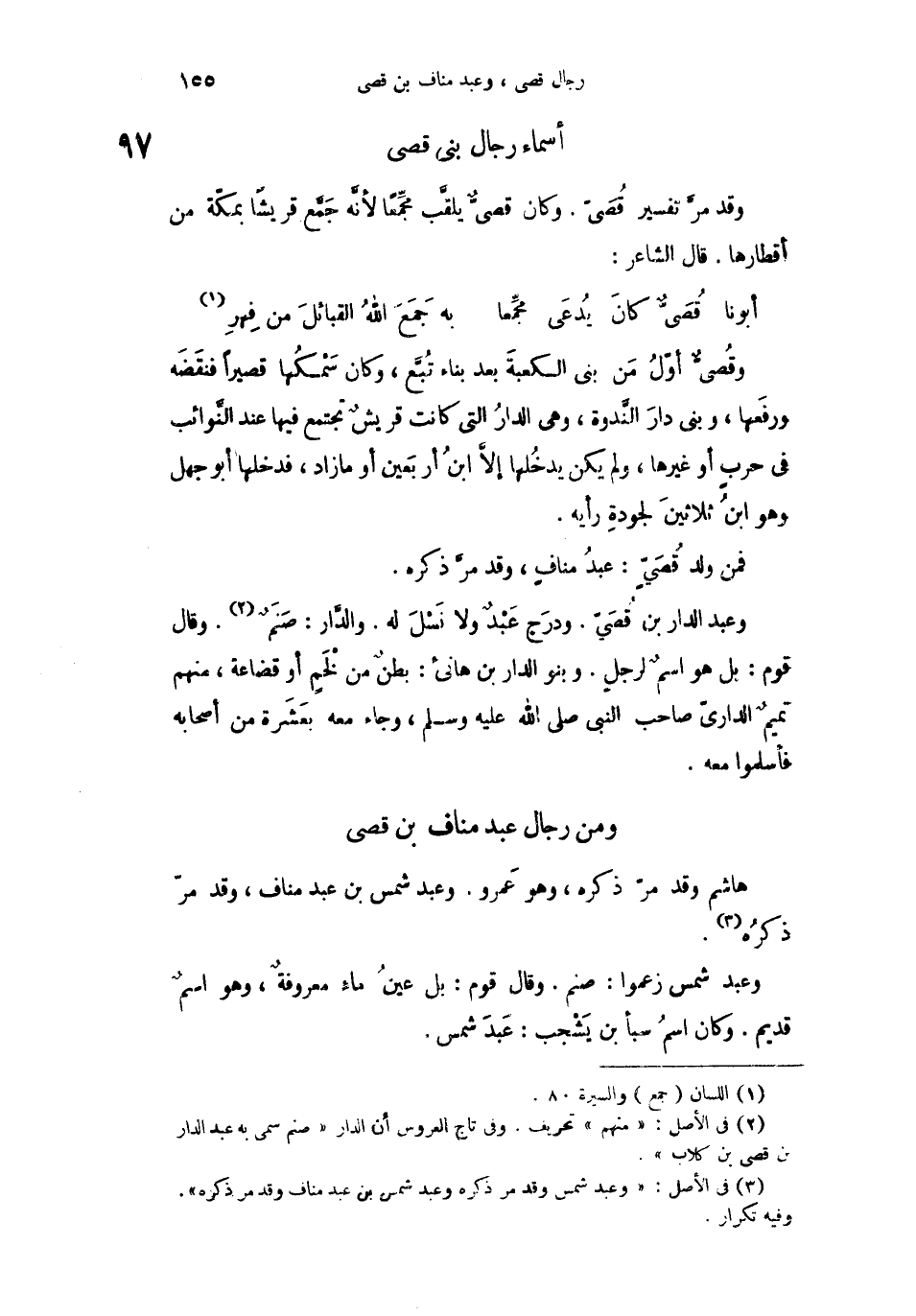 وقد مرَّ تفسير قُصَيّ. وكان قصيٌّ يلقَّب مجِّمعاً لأنَّه جَمَّع قريشاً بمكة من أقطارها. قال الشاعر: