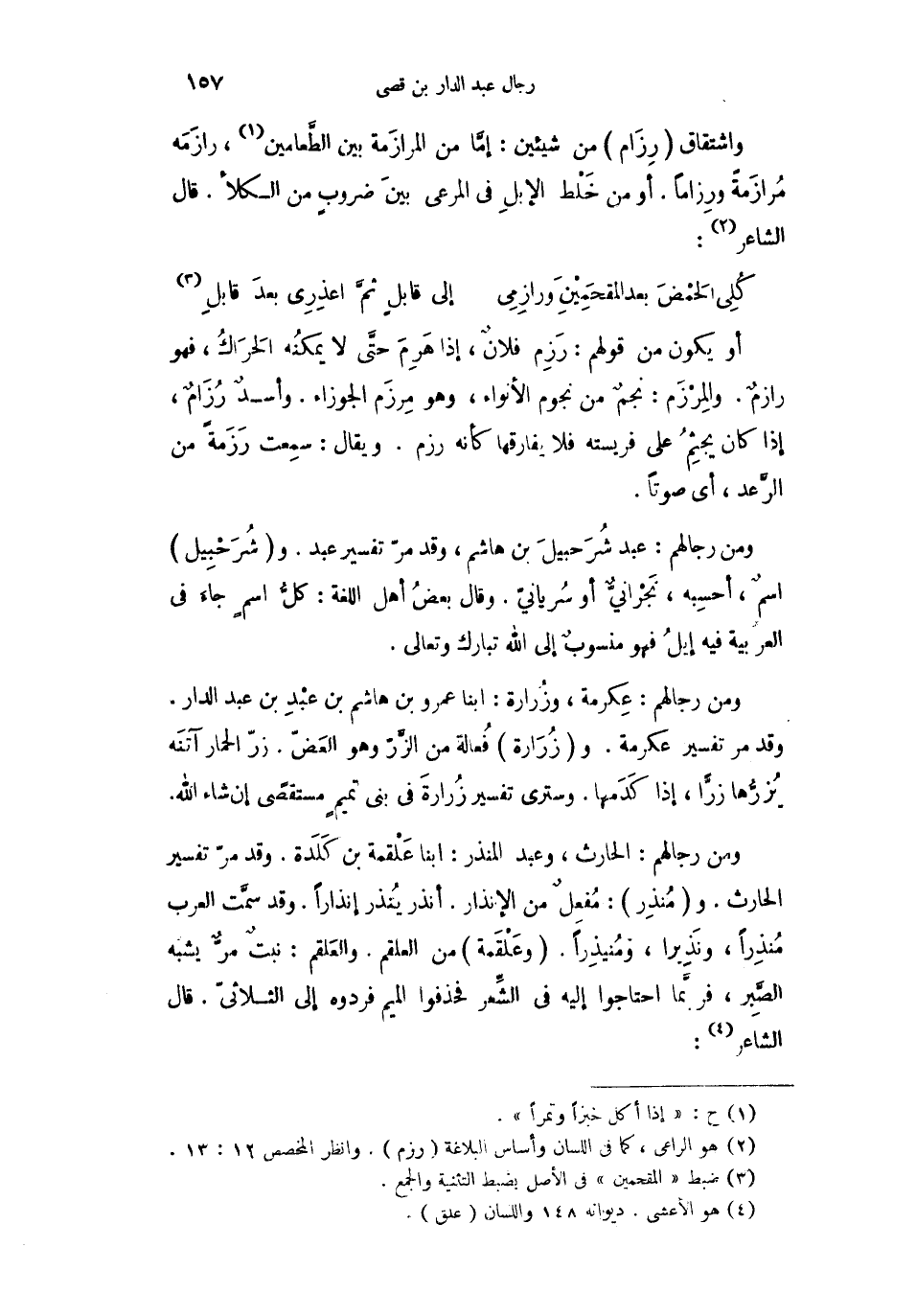 ومن رجالهم: عِكرمة، وزُرارة: ابنا عمرو بن هاشم بن عبْدِ بن عبد الدار. وقد مر تفسير عكرمة. وزُرَارة فُعالة من الزَّرّ وهو العَضّ. زرّ الحمار آتَتَه يُزرُّها زرّاً، إذا كَدَمها. وسترى تفسير زُرارةَ في بني تميمٍ مستقصىً إن شاء الله.