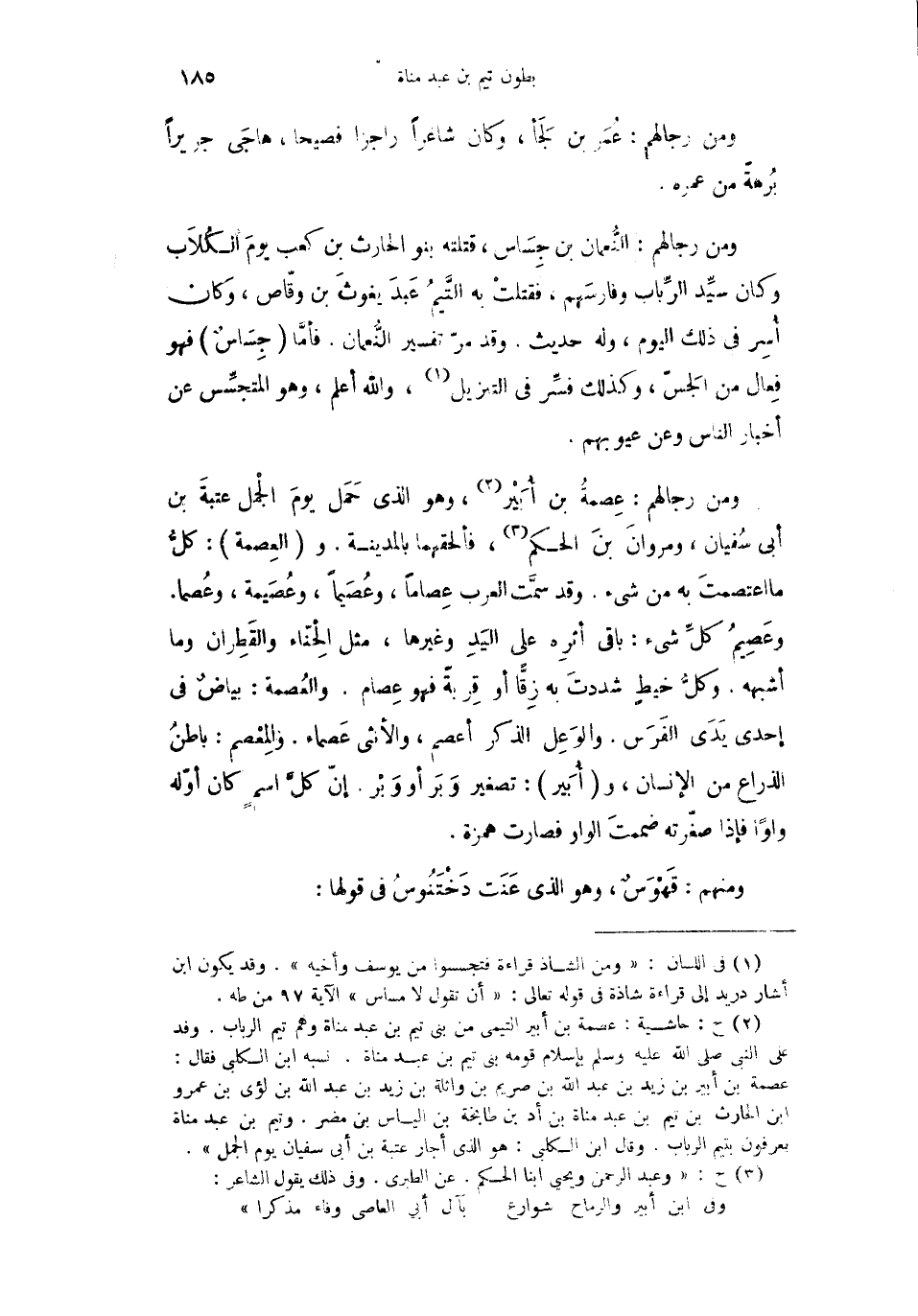 ومن رجالهم: عِصمةُ بن أُبَيْر، وهو الذي حَمَل يومَ الجمل عتبةَ بن أبي سُفيان، ومروانَ بنَ الحكم، فألحقهما بالمدينة. والعِصمة: كلُّ ما اعتصمتَ به من شيء. وقد سمَّت العرب عِصاماً، وعُصَيماً، وعُصَيمة، وعُصماً. وعَصِيمُ كلِّ شيء: باقي أثرِه على اليَدِ وغيرها، مثل الحِنَّاء والقَطِران وما أشبهه، وكلُّ خيطٍ شددتَ به زِقّاً أو قِربةً فهو عِصام. والعُصمة: بياضُ في إحدى يَدَي الفَرَس. والوَعِل الذكر أعصم، والأنثى عَصماء. والمِعْصم: باطنُ الذراع من الإنسان، وأُبَير: تصغير وَبَر أو وَبْر. إنّ كلَّ اسمٍ كان أوّله واواً فإذا صغّرته ضممتُ الواو فصرت همزة.