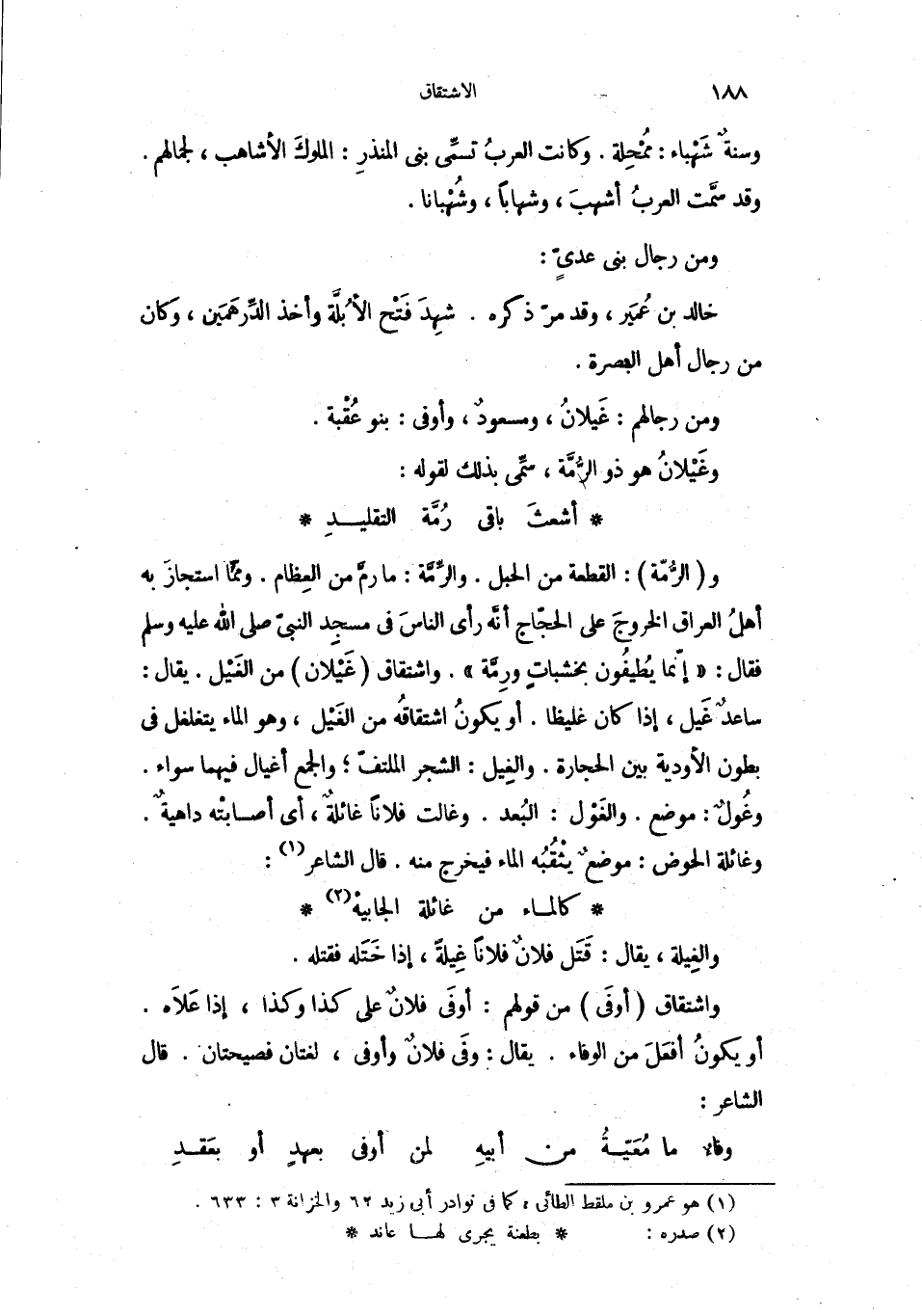 والرُّمَة: القطعة من الحبل. والرِّمَّة: ما رمَّ من العِظام. وممّا استنجازَ به أهلُ العراق الخروجَ على الحجَاج أنَّه رأى الناسَ في مسجدِ النبي صلى الله عليه وسلم فقال: " إنما يُطيفُون بخشباتٍ ورِمَّة " واشتقاق غَيْلان من الغَيْل. يقال: ساعدٌ غَيل، إذا كان غليظاً. أو يكونُ اشتقاقهُ من الغَيْل، وهو الماء يتغلغل في بطون الأودية بين الحجارة. والغِيل: الشجر الملتفّ؛ والجمع أغيال فيهما سواء. وغُولٌ: موضع. والغَوْل: البُعد. وغالت فلاناً غائلةٌ، أي أصابتُه داهيةٌ. وغائلة الحوض: موضعٌ يثْقُبُه الماء فيخرج منه. قال الشاعر: