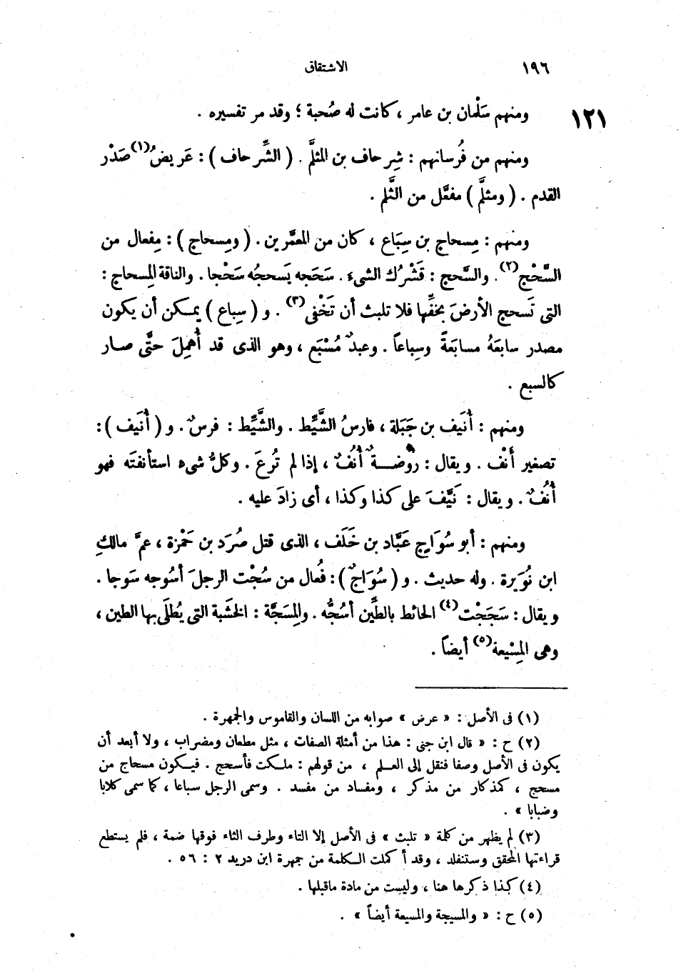 ومنهم: مِسحاج بن سِبَاع، كان من المعمَّرين. ومِسحاج: مِفعال من السَّحْج. والسَّحج: قَشْرُك الشيءَ. سَحَجه يَسحجُه سَحْجاً. والناقة المِسحاج: التي تَسحج الأرضَ بخفِّها فلا تلبث أن تَخْفى. وسِباع يمكن أن يكون مصدر سابعَهُ مسابعَةً وسِباعاً. وعبدٌ مُسْبَع، وهو الذي قد ُهِملَ حتَّى صار كالسبع.