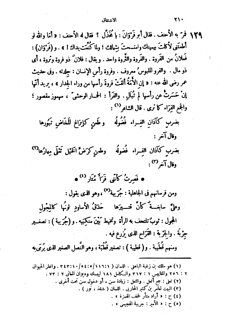 قمرّ به الأحنف. فقال أبو فَرْوَانَ: يا مُخَذِّل؟ فقال له الأحنف: " أمَا والله لو أطعتَني لأكلتَ بيمينك وامتسحتَ بِشمالك؛ ولما كُنِّعَت يداك! " وفَرْوَان: فَعلانُ من الفَروة، والفَروة والثَّروة واحد. ويقال: فلانٌ ذو فروة وثروة، أي ذو مال. والفرو الملبوسُ معروف. وفروة رأسِ الإنسان: جِلدته. وفي حديث عمر رضي الله عنه: " إنِ الأَمَةُ ألقَتْ فروةَ رأسها من وراء الجِدار "، يريد أنّها إنْ حَسَرت عن رأسها لم تُبَالِ. والفَرأ: الحمار الوحشيّ، مهموز مقصور؛ والجمع الفِرَاء كما ترى. قال الشاعر: