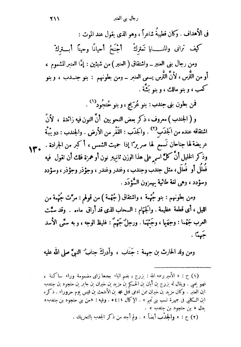 ومن رجال بني العنبر واشتقاق العنبر من شيئين: إمَّا العنبر المشموم، أو من التُّرس، لأنَّ التُّرس يسمى العنبر ومن بطونهم: بنو جندب، وبنو كعب، وبنو مالك، وبنو بَشَّة.