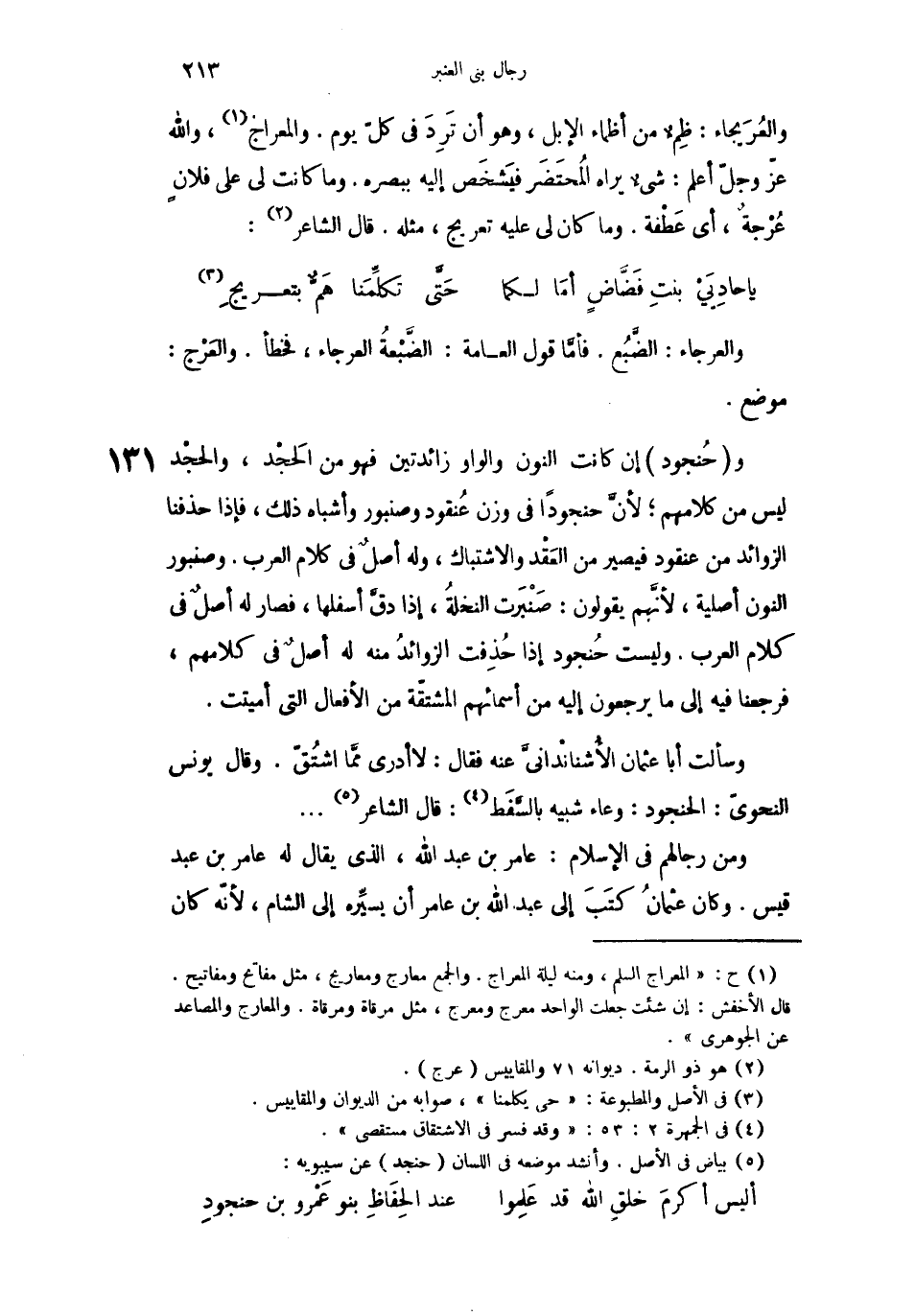 وحُنجود إن كانت النون والواو زائدتين فهو من الحَجْد، والحجْد ليس من كلامهم؛ لأنَّ حنجوداً في وزن عُنقود وصنبور وأشباه ذلك، فإذا حذفنا الزوائد من عنقود فيصير من العَقْد والاشتباك، وله أصلٌ من كلام العرب. وصنبور النون أصلية، لأنَّهم يقولون: صَنْبَرت النخلةُ، إذا دقَّ أسفلها فصار له أصلٌ في كلام العرب. وليست حُنجود إذا حُذِفت الزوائدُ له أصلٌ في كلامهم، فرجعنا فيه إلى ما يرجعون إليه نم أسمائهم المشتقة من الأفعال التي أميتت.