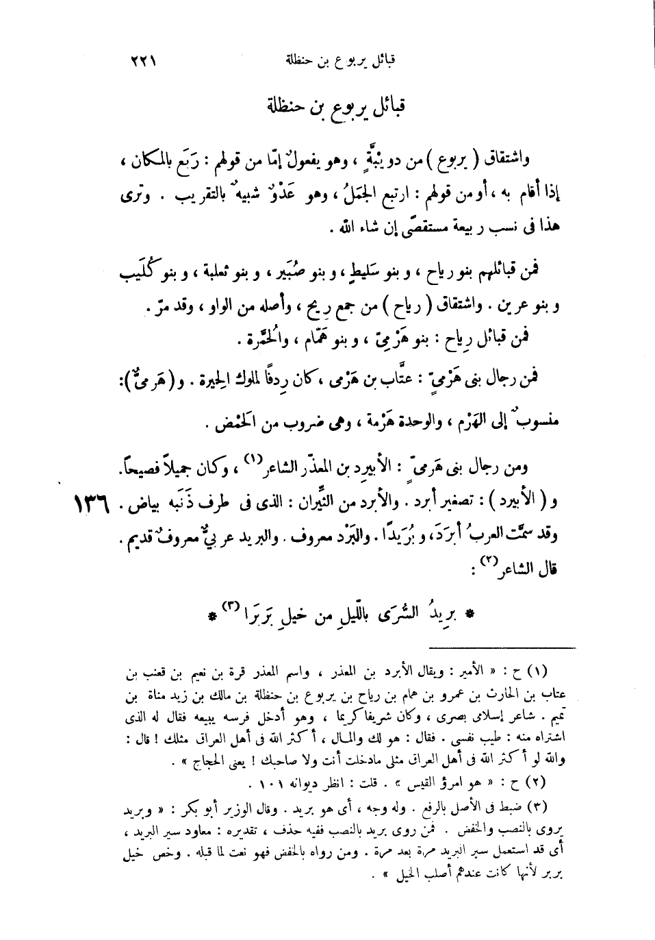 ومن رجال بني هَرميٍّ: الأبيرِد بن المعذّر الشاعر، وكان جميلاً فصيحاً. والأبيرد: تصغير أبرد والأبرد من الثِّيران: الذي في طرف ذَنَبه بياض. وقد سمَّت العربُ أبرَدَ، وبُرَيداً. والبَرْد معروف. والبريد عربيٌّ معروفٌ قديم. قال الشاعر: