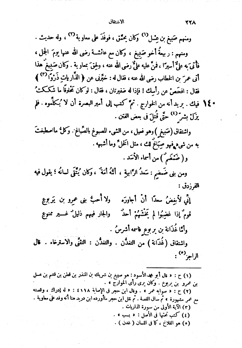 ومنه: ربيعةُ أخو صَبِيغ، وكان مع عائشة رضي الله عنها يومَ الجمل، فأُتيَ به عليٌّ أسيراً، فمنَّ عليه عليٌّ رضي الله عنه، ولحِقَ بمعاوية. وكان صَبِيغٌ هذا أتى عمرَ بن الخطاب رضي الله عنه فقال له: خبِّرني عن " الذَّارياتِ ذَرْواً " فقال: افحَصْ عن رأسِك! فإذا له ضفيرتان، فقال: لو كان مَحْلوقاً ما شككتُ فيك. يريد انه من الخوارج. ثمَّ كتب إلى أمير البصرة أن لا يُكلِّموه. فلم يزَلْ بشرٍّ حتَّى قُتِلَ في بعض الفتن.