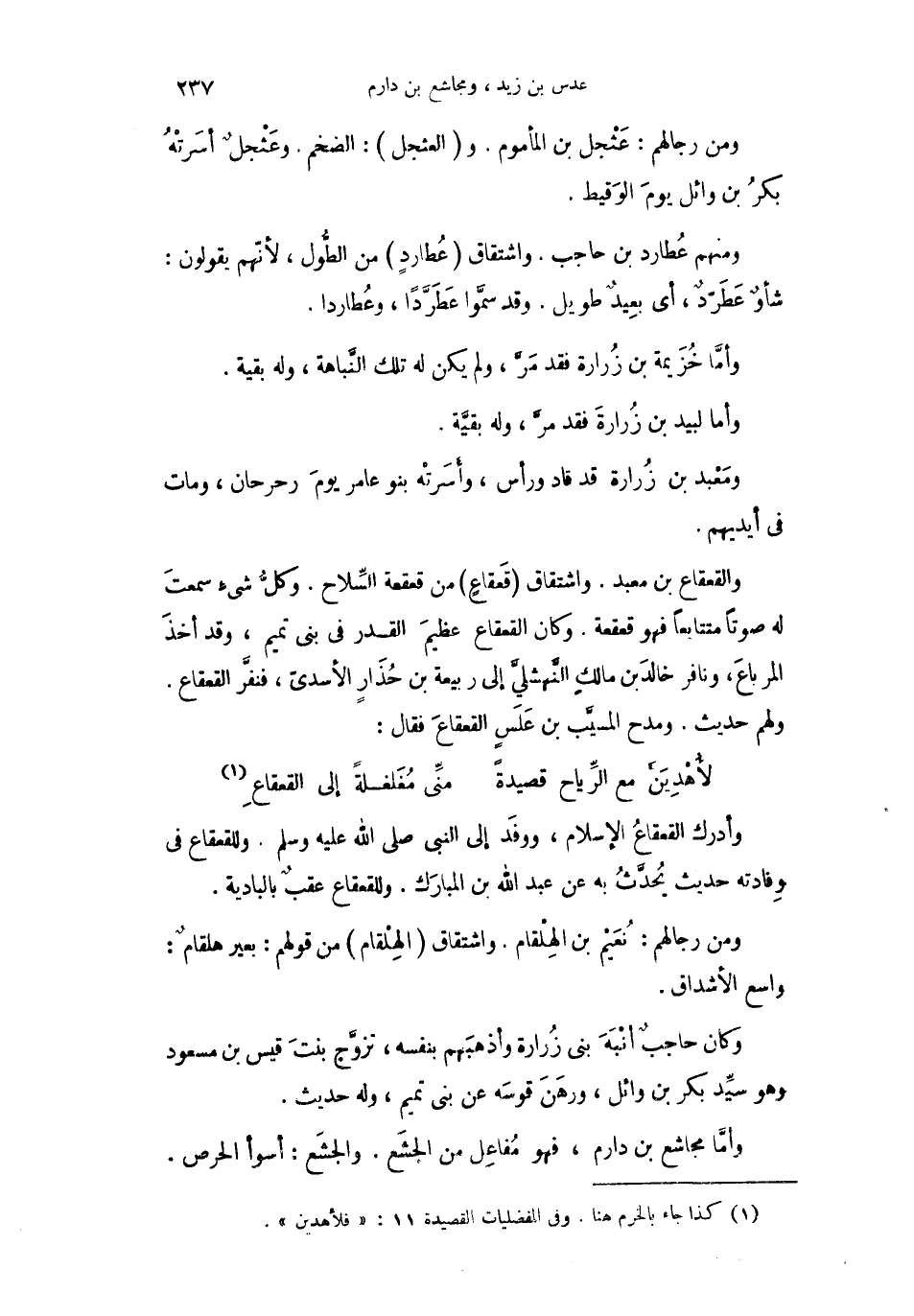 والقعقاع بن معبد. واشتقاق قَعقاعٍ من قعقة السِّلاح. وكلُّ شيءٍ سمعتَ له صوتاً متتابعاً فهو قعقعة. وكان القعقاع عظيمَ القدر في بني تميم، وقد أخذَ المرباعَ، ونافر خالدَ بن مالكٍ النَّهشليَّ إلى ربيعة بن حُذَارٍ الأسديّ، فنفرَّ القعقاع. ولهم حديث. ومدح المسيَّب بن عَلَسٍ القعقاعَ فقال: