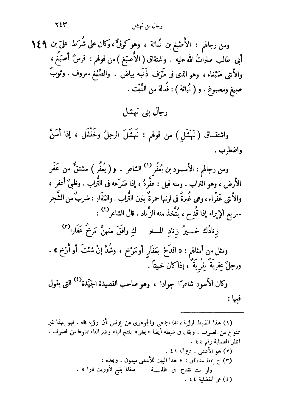 ومن رجالهم: الأَصْبغ بن نُباتة، وهو كوفيٌّ، وكان على شُرَط علي بن أبي طالب صلواتً الله عليه، واشتقاق الأَصبَغ من قولهم: فرسٌ أصبَغُ، والأنثى صَبْغاء، وهو الذي طَرَف ذَنَبه بياض. والصٍّبغ معروف. وثوبٌ صبيغ ومصبوغ. ونُباتة: فُعالة من النَّبْت.