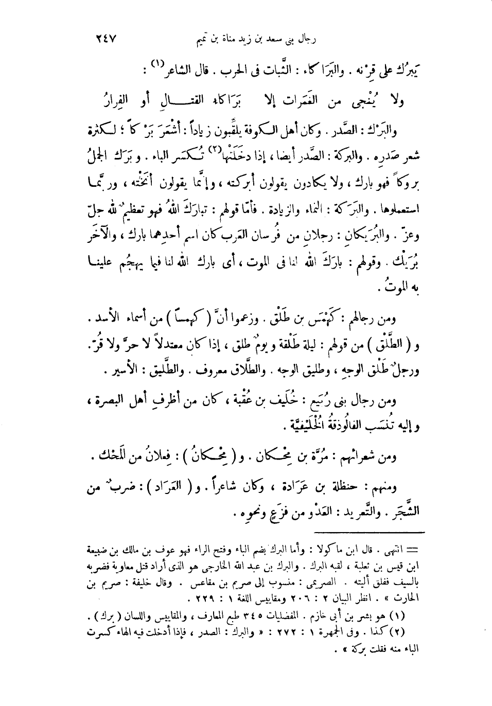 والبَرْك: الصَّدر. وكان أهل الكوفة يلقِّبون زياداً: أشْعَرَ بَرْكاً؛ لكثرة عر صَدرِه. والبركة: الصَّدر أيضاً، إذا دخَلَتْها تُكسَر الباء، وبَرَك الجملُ بروكاً فهو بارك، ولا يكادون يقولون أبركته، وإنمَّا يقولون أنَخْته، وربمَّا استعملوها. والبَرَكة: النماء والزيادة. فأمّا قولهم: تبارَكَ اللهُ فهو تعظيمٌ لله جل وعزّ. والبُرَيكانِ: رجلانِ من فُرسان العَرب كان اسم أحدِهما بارك، والآخرَ بُرَيْك. وقولهم: بارَكَ الله لنا في الموت، أي بارك الله لنا فيما يهجُم علينا به الموتُ.