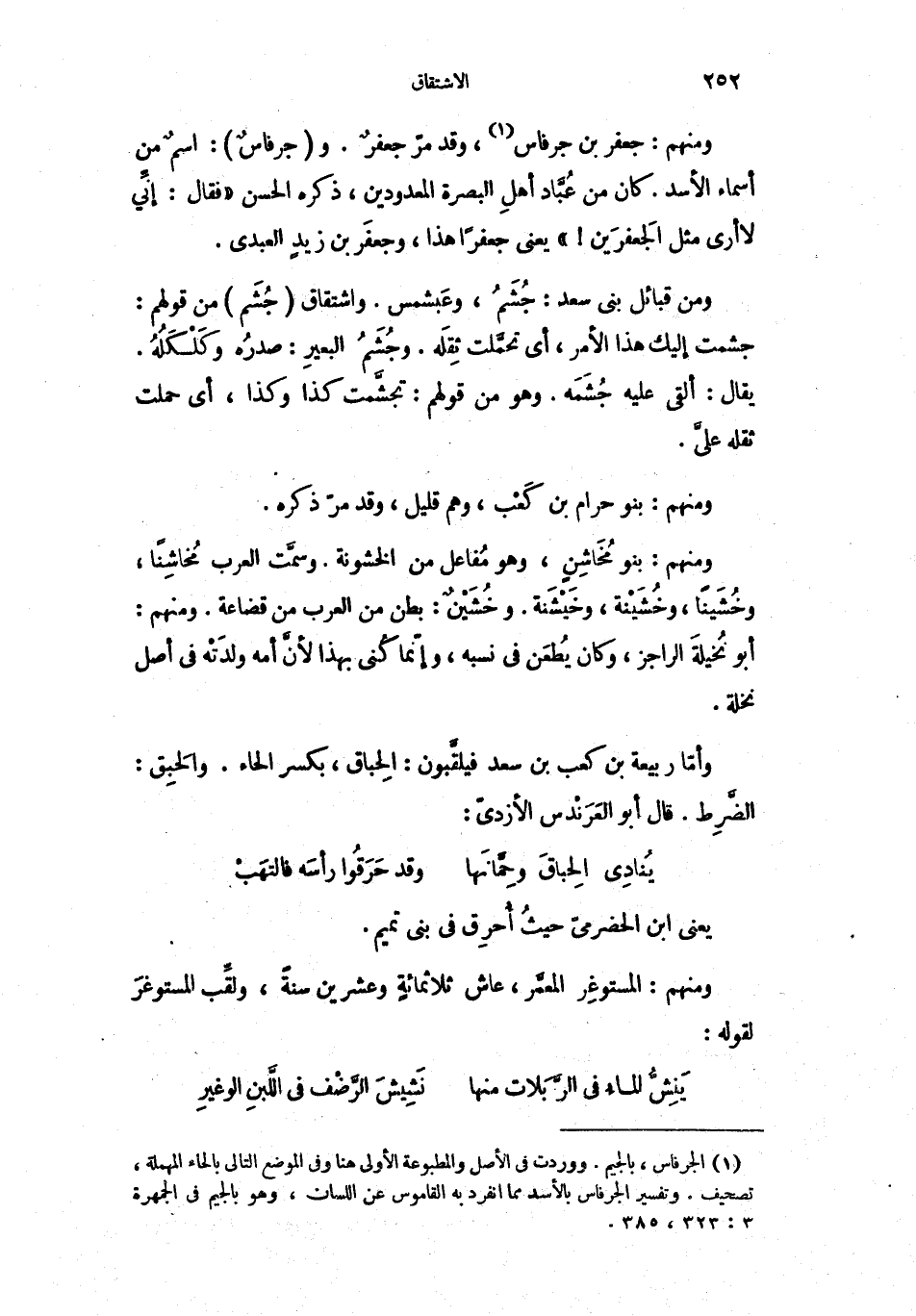 ومن قبائل بني سعد: جُشَمُ، وعَبشمس. واشتقاق جُشَم من قولهم: جشمت إليك هذا الأمر، أي تحمَّلت ثِقَله. وجُشَمُ البعيرِ: صدرُه وكَلْكَلُهُُ. يقال: ألقى عليه جُشَمَه. وهو من قولهم: تجشَّمت كذا وكذا، أي حملت ثقله عليَّ.