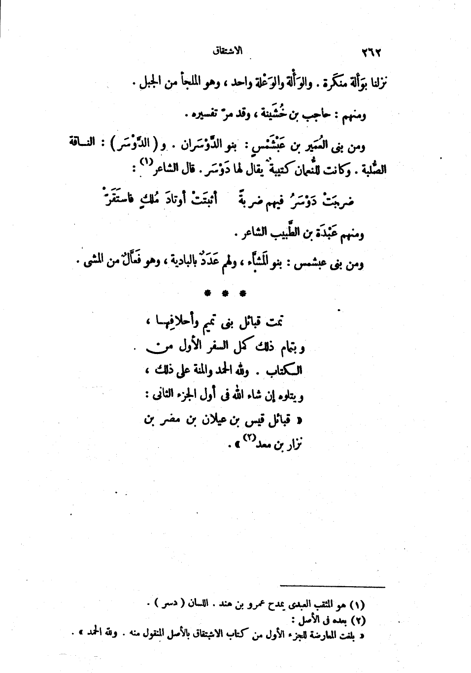 تمت قبائل بني تميم وأحلافِها، وبتمام ذلك كمل السفر الأول من الكتاب. ولله الحمد والمنة على ذلك، ويتلوه إن شاء الله في أول الجزء الثاني: قبائل قيس بن عيلان بن مضر بن نزار بن معد.