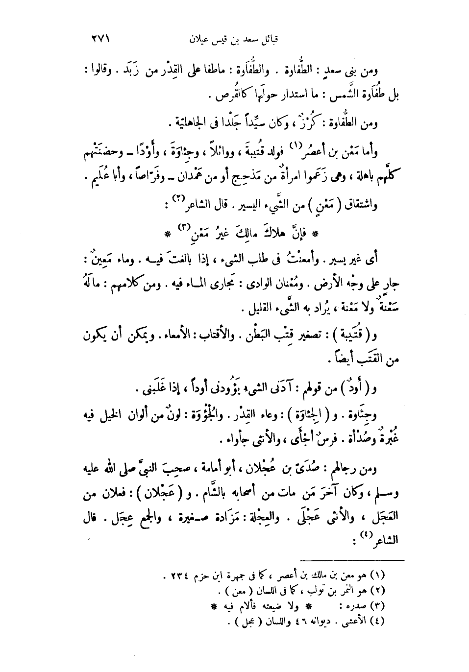 وأما مَعْن بن أعصُر فولد قُتيبةَ ووائلاً، وجِثاوَةَ، وأَوْداً. وحضنَتهم كلهم باهلة، وهي زَعَموا امرأةٌ من مَذحِج أو من هَمْدان. وفَرّاصاً، وأبا عُلَيم.