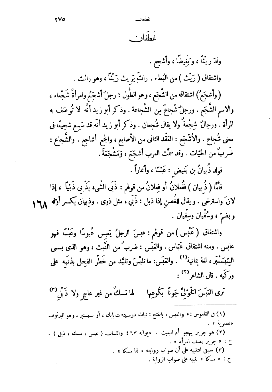 فأمَّا ذُبِيان ففُعلانُ أو فِعلانُ من قولهم: ذَبَى الشيءُ يَذْبِي ذَبْياً، إذا لانَ واسترخى. ويقال للغُصنِ إذا ذبل: ذَبَي، مثل ذوي. وذِبيانَ يكسر وّله ويضمّ، وسُفْيان وِسِفْيان.