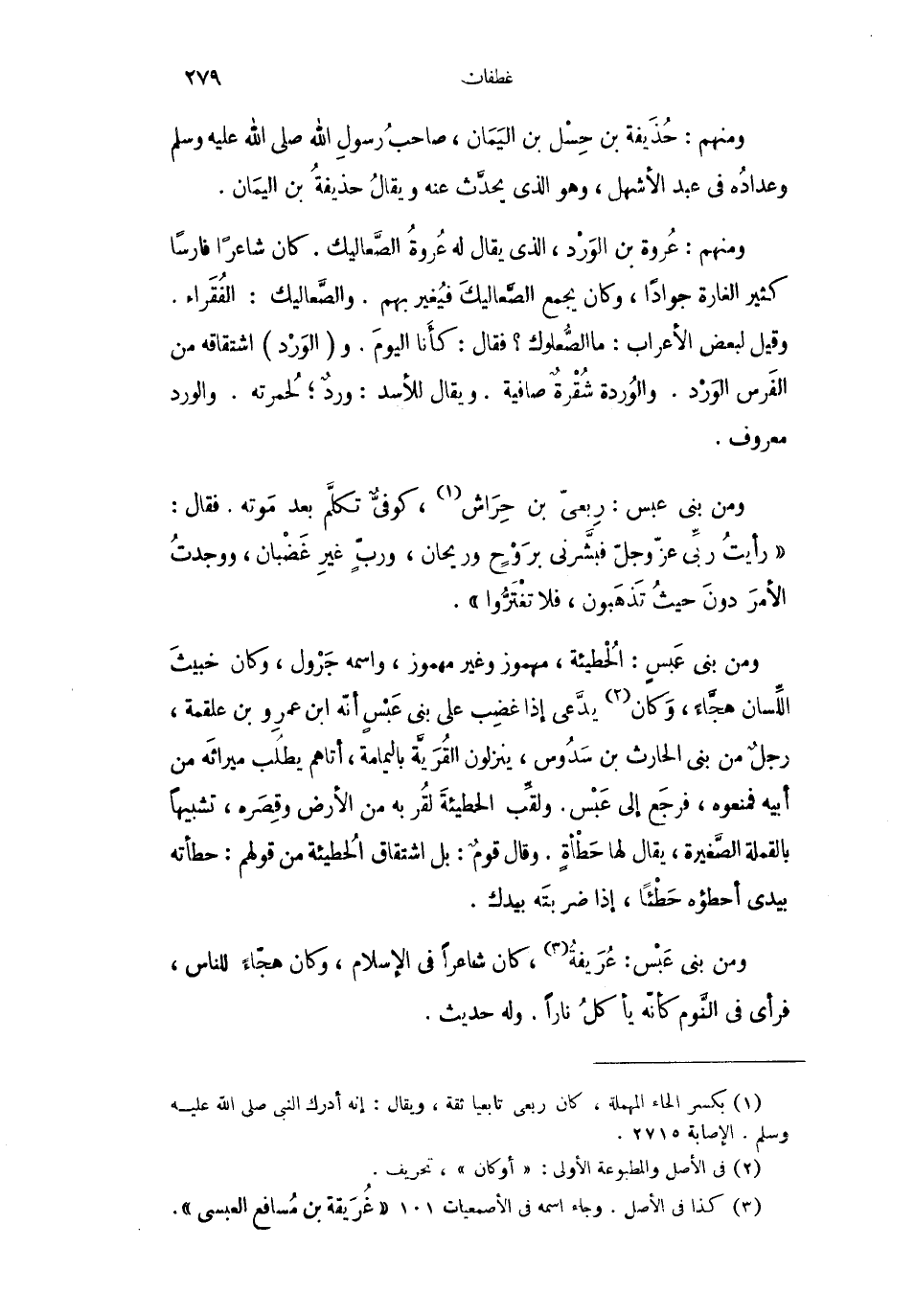 ومنهم: حُذَيفة بن حِسْل بن اليَمّان، صاحبُ رسولِ الله صلى الله عليه وسلم وعدادُه في عيد الأشهل، وهو الذي يحدًّث عنه ويقالُ حذيفةُ بن اليمَان.