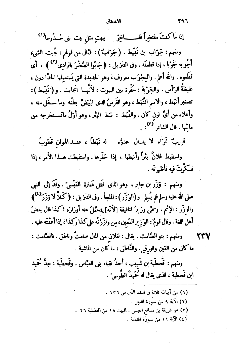 ومنهم: جَوّاب بن نُبَيط. جَوّابٌ: فعَّال من قولهم: جُبت الشيءَ أجُوبه جَوْباً. إذا قطعتَه. وفي التنزيل: " جَابُوا الصَّخْرَ بالوادِي "، أي قَطعوه. والله أعلم. والمِجْوَب معروف، وهو الحديدة، التي يَستعمِلها الحدَّادون، غليظةُ الرّأس. والجَوْبة: حُفْرة بين البيوت، لأنَّها انجابت. ونُبَيط: تصغير أنبَط، والاسم النَّبَط، وهو الفَرسُ الذي ابْيَضَّ بطُنه وما سفَل منه، وأعلاه من أيِّ لونٍ كان. والنَّبَط: نَبط البئِر، وهو أوّلُ ما تستخرجه من مائِها. قال الشاعر: