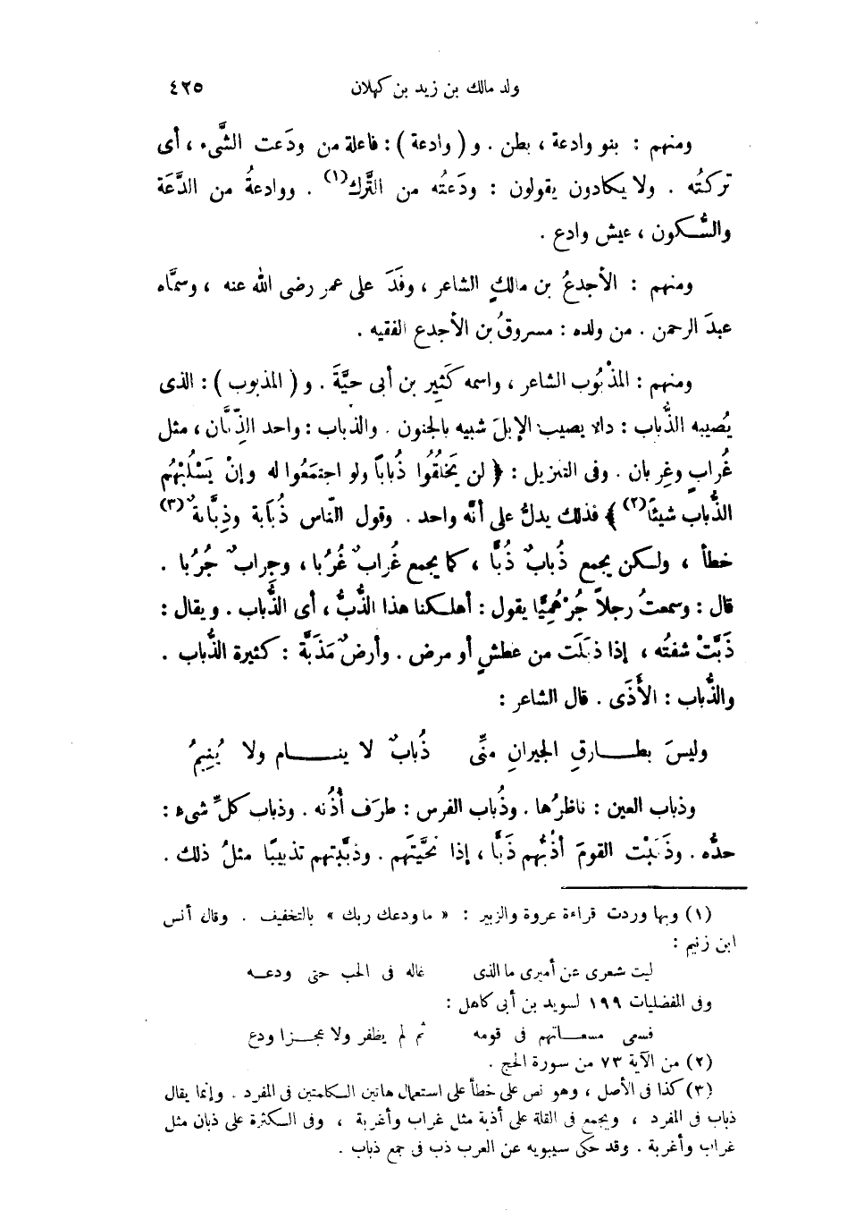 ومنهم: المذْبُوب الشاعر، واسمه كَثِير بن أبي حيَّةَ. والمذبوب: الذي يُصيبه الذُّباب: داءٌ يصيب الإبلَ شيبيه بالجنون. والذباب: واحد الذِّبَّان، مثل غُرابٍ وغِربان. وفي التنزيل: " لن يَخلُقُوا ذُباباً ولو اجتمعُوا له وإنْ يَسْلُبْهُم الذُّباب شيئاً ". فذلك يدلُّ على أنَّه واحد. وقول النّاس ذُبَّانةٌ خطأ، ولكن يجمع ذُبابٌ ذُبَّاً، كما يجمع غُرُبا، وجِرابٌ جُرُبا. قال: وسمعتُ رجلاً جُرْهُمِيَّاً يقول: أهلكنا هذا الذُّبُّ، أي الذُّباب. ويقال: ذَبَّتْ شفتُه، إذا ذبَلَت من عطشٍ أو مرض. وأرضٌ مَذَبَّة: كثيرة الذُّباب. والذُّباب: الأَذَى. قال الشاعر: