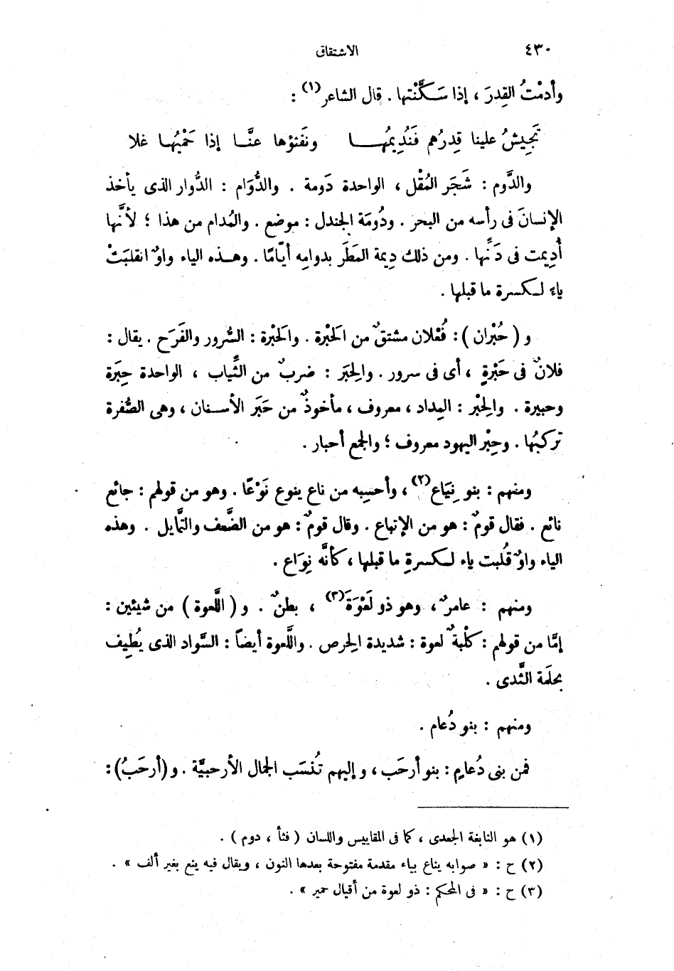 والدَّوم: شَجَر المُقْل، الواحدة دَوِمة. والدُّوَام: الدُّوار الذي يأخذ الإنسانَ في رأسه من البحر. ودُوامِه الحنبل موضع والدام من هذا، لأنها ادعت من دونها ومن ذلك ديمه المطر يدامه أيّاماً. وهذه الياء وَاوٌ انقلبَتْ ياءَ لكسرة ما قبلها.