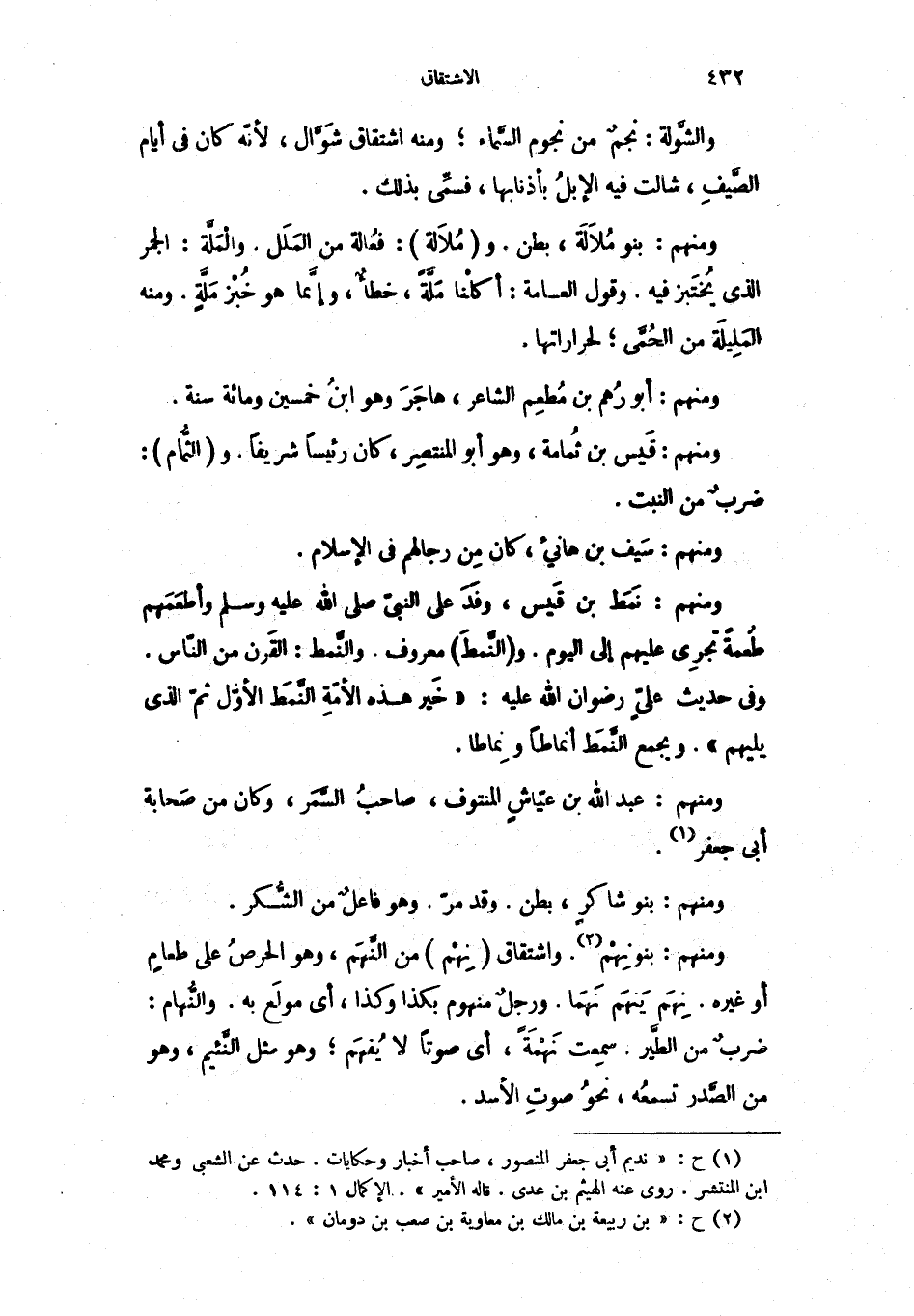 ومنهم: نَمَط بن قَيس، وفَدَ على النبيّ صلى الله عليه وسلم وأطعَمَهم طُعمةً تجرِي عليهم إلى اليوم. والنَّمطَ معروف والنَّمط: القَرن من النَّاس. وفي حديث عليٍّ رضوان الله عليه: " خَير هذه الأمّةِ النَّمَط الأوّل ثمّ الذي يليهم. ويجمع النَّمَط أنماطاً ونِماطاً.