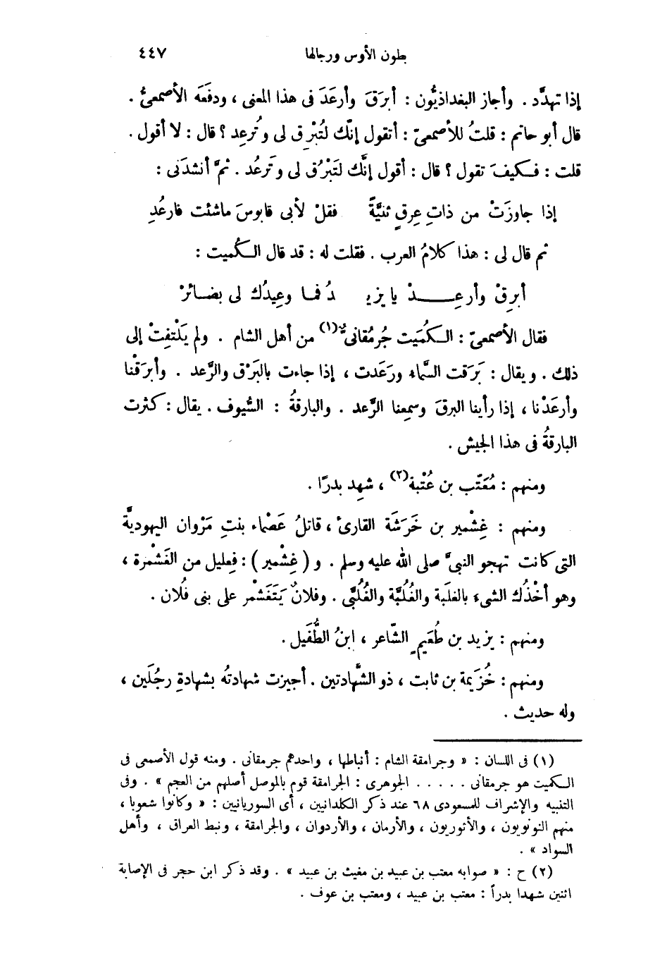 فقال الأصمعيّ: الكُمَيت جُرمُقانيٌّ من أهل الشام. ولم يَلْتفِتْ إلى ذلك. ويقال: بَرَقت السَّماءُ ورَعَدت، إذا جاءت بالبَرْق والرَّعد. وأبرَقْنا وأرعَدْنا، إذا رأينا البرقَ وسمِعنا الرَّعد. والبارقةُ: السُّيوف. يقال: كثرت البارقةُ في هذا الجيش.