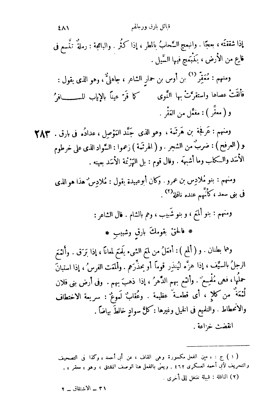ومنهم: عَرفجة بن هَرثَمة، وهو الذي جَنَّد المَوْصِل، عدادُه في بارق. والعرفح: ضربٌ من الشجر. والهرثَمة زعموا: السَّواد الذي على خرطوم الأسَد والكلب وما أشبههَ. وقال قوم: بل الهَرْثمة الأسَد بعينه.