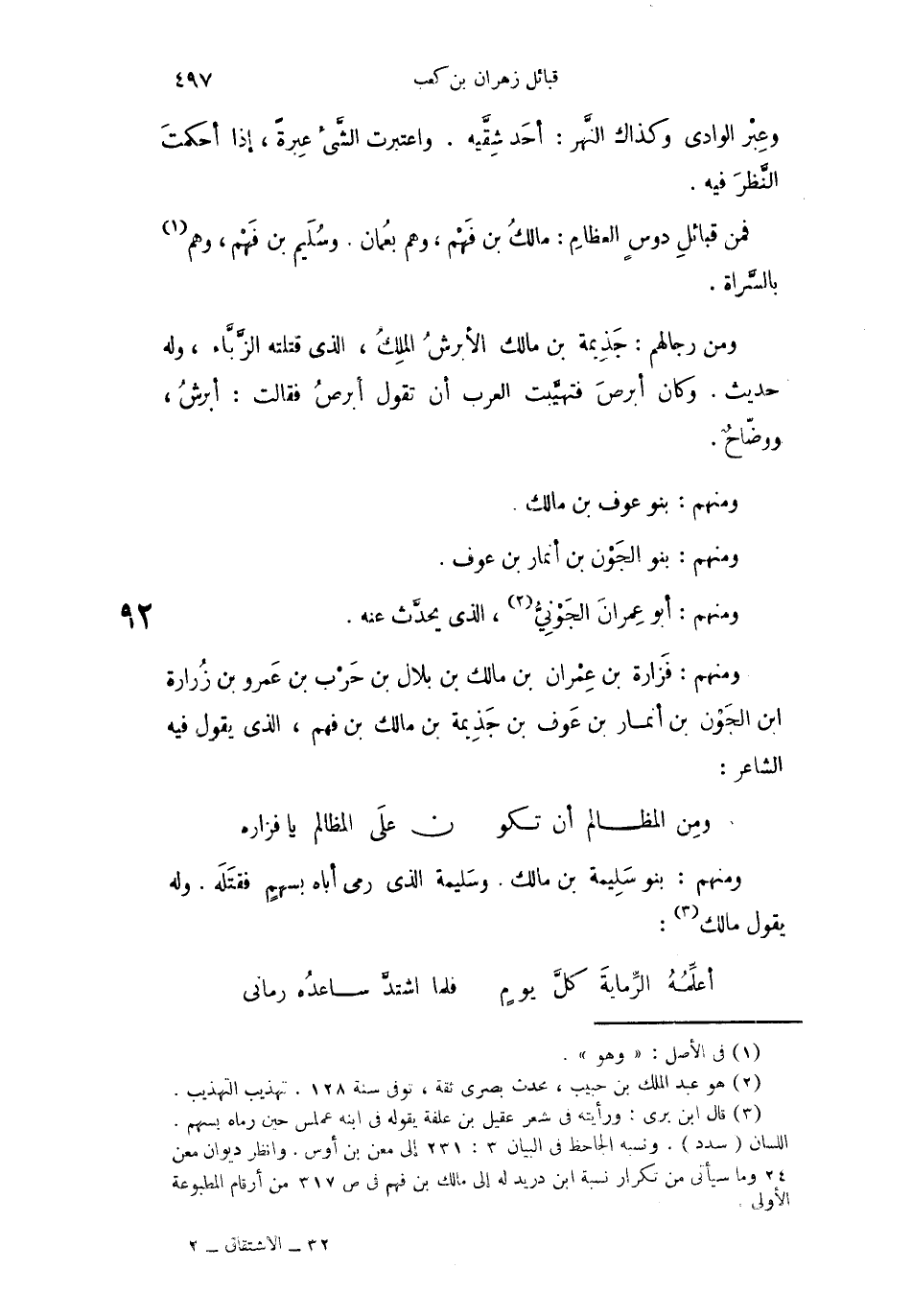 فمن قبائلِ دوسٍ العظامِ: مالكُ بن فَهْم، وهما بعُمان. وسُلَيم بن فَهْم، وهم بالسَّراة.
