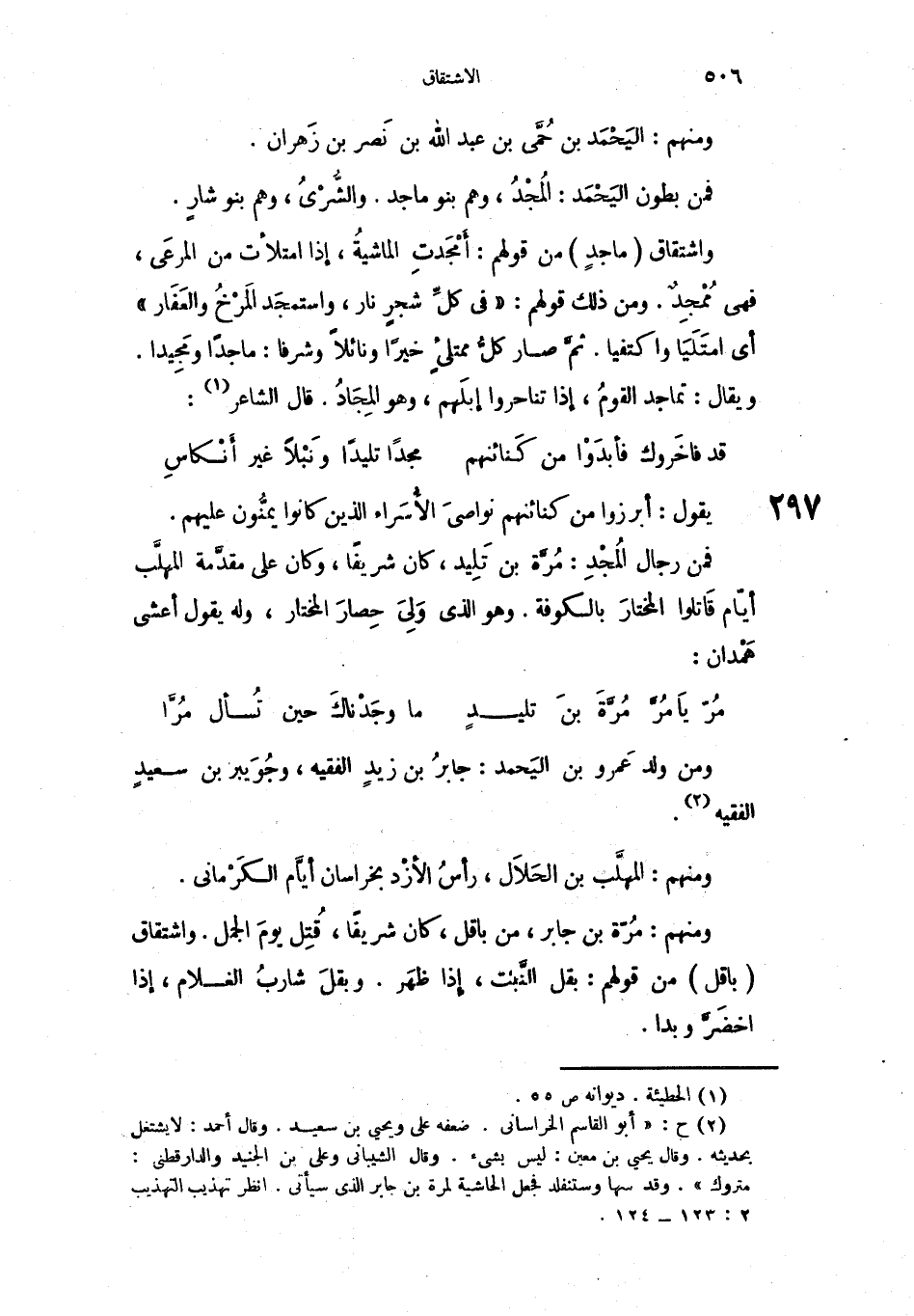 واشتقاق ماجدٍ من قولهم: أَمْجَدتِ الماشيةُ، إذا امتلأت من المرَعي، فهي مُمْجِدٌ. ومن ذلك قولهم: في كلِّ شجرٍ نار، واستمجَد المَرْخُ والعَفَار، أي امتَلَيَا واكتفيا. ثمَّ صار كلُّ ممتلئٍ خيراً ونائلاً وشرفاً: ماجداً ومَجِيداً. ويقال: تماجد القومُ، إذا تناحروا إبلَهم، وهو المِجَادُ. قال الشاعر: