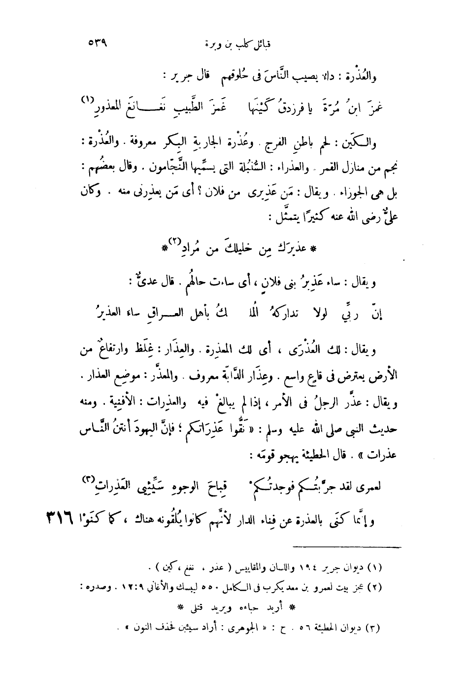 ويقال: لك العُذْرَى، أي لك المعذِرة. والعِذَار: غِلَظ وارتفاعٌ من الأرض يعترض في قاعٍ واسع. وعِذَار الدَّابَة معروف. والمعذَّر: موضِع العذار. ويقال: عذَّر الرجلُ في الأمر، إذا لم يبالغْ فيه والعذِرات: الأفنِية. ومنه حديث النبي صلى الله عليه وسلم: " نَقُّوا عَذِرَاتكم؛ فإنَّ اليهودَ أنتنُ النَّاس عذرات ". قال الحطيئة يهجو قومَه: