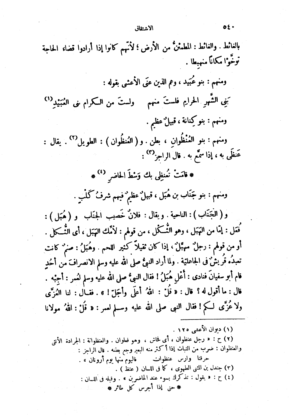 والجَنَاب: الناحية. ويقال: فلانٌ خَصيب الجنَاب وهُبَل: فُعَل: إمَا من الهَبَل، وهو الثُّكْل، من قولهم: لأمِّك الهَبَل، أي الثُّكل. أو من قولهم: رجلٌ مهبَّلٌ، إذا كان ثقيلاً كثير اللحم وهُبَلُ: صنمٌ كانت تعبدُه قُريشٌ في الجاهليّة. ولما أراد النبيُّ صلى الله عليه وسلم الانصرافَ من أحُدٍ قام أبو سفيانَ فنادى: أَعْلِ هُبَلُ! فقال النبيُّ صلى الله عليه وسلم لعُمر: أجِبْه. قال: ما أقول له؟ قال: " قُلْ: اللهُ أعلَى أجَلّ! ". فقال: لنا العُزَّى ولا عُزَّى لكم! فقال النبي صلى الله عليه وسلم لعمر: " قُلْ: اللهُ مولانا