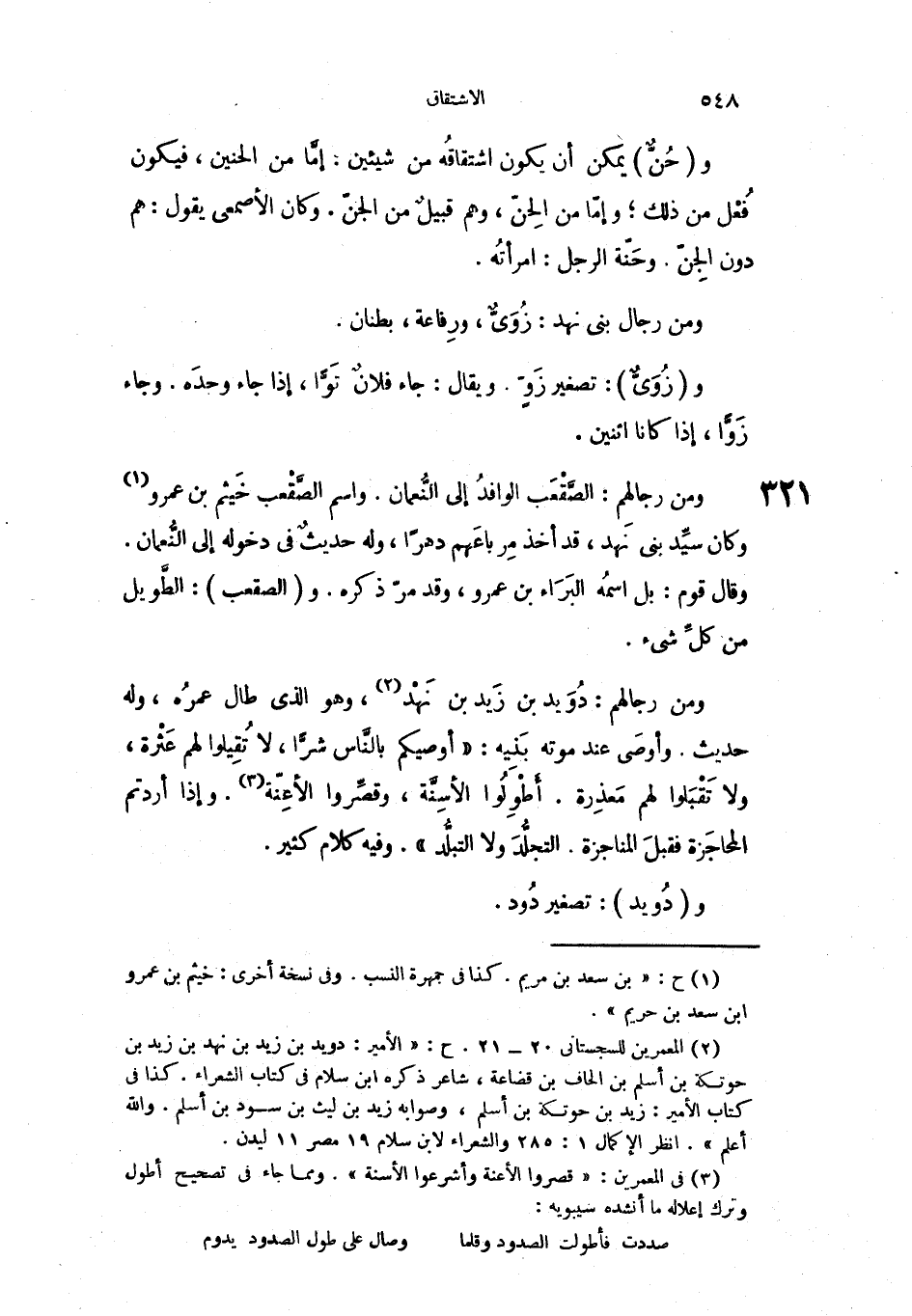 وحُنٌّ يمكن أن يكون اشتقاقُه من شيئين: إمَّا من الحنين، فيكون فُعْل من ذلك؛ وإمّا من الحِنّ، وهم قبيلٌ من الجنّ. وكان الأصمعي يقول: هم دون الجِنّ. وحَنّة الرجل: امرأتهُ.