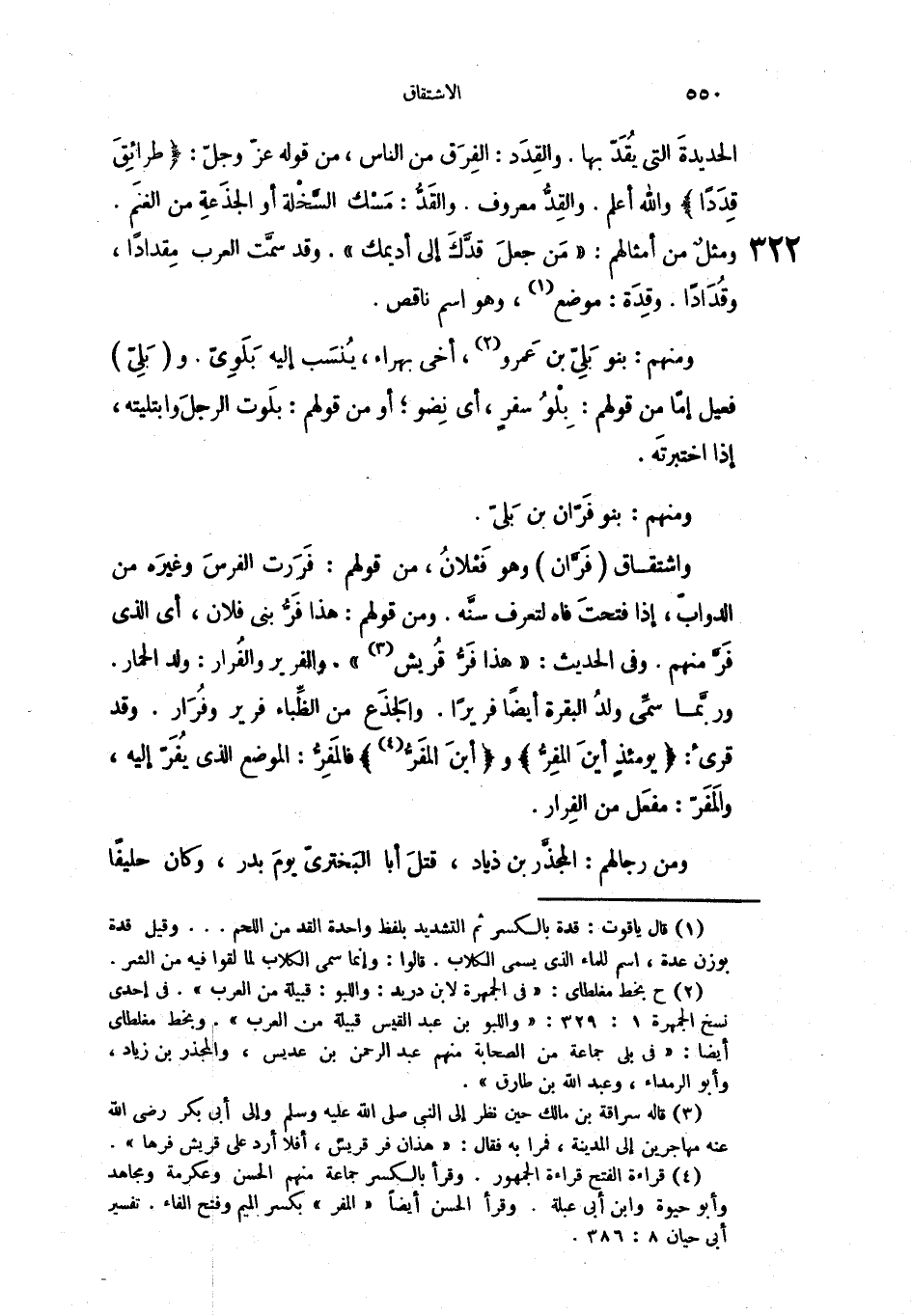 واشتقاق فَرَّان وهو فَعْلانُ، من قولهم: فَرَرت الفرسَ وغيرَه من الدوابّ، إذا فتحتَ فاه لتعرف سنَّه. ومن قولهم: هذا فَرُّ بني فلان، أي الذي فَرَّ منهم. وفي الحديث: " هذا فَرُّ قُريش ". والفرير والفُرار: ولد الحمار. وربمَّا سمِّي ولدُ البقرة أيضاً فريراً. والجَذَع من الظَّباء فرير وفُرَار. وقد قرئ: " يومئذٍ أينَ المفِرُّ " و " ابنَ المفَرُّ " فالمَفِرُّ: الموضع الذي يُفَرّ إليه، والمَفَرّ: مفعَل من الفِرار.