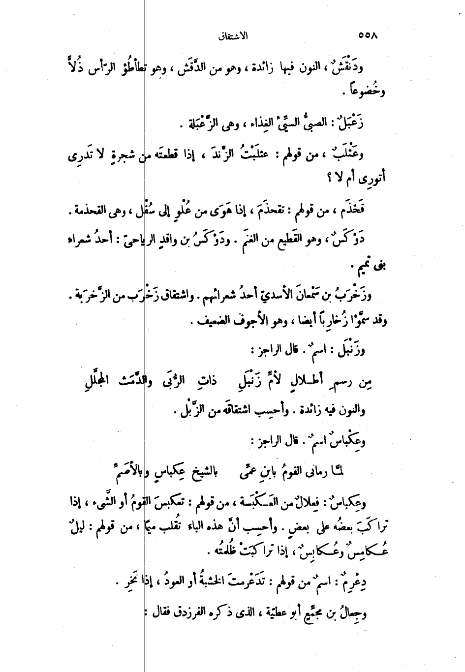 وعَثْلَبٌ، من قولهم: عثلَبْتُ الزَّندَ، إذا قطعتَه من شجرةٍ لا تَدرِي أتورِي أم لا؟ قَحْذَم، من قولهم: تقحذَمَ إذا هَوَى من عُلْوٍ إلى سُفْل، وهي القحذمة.